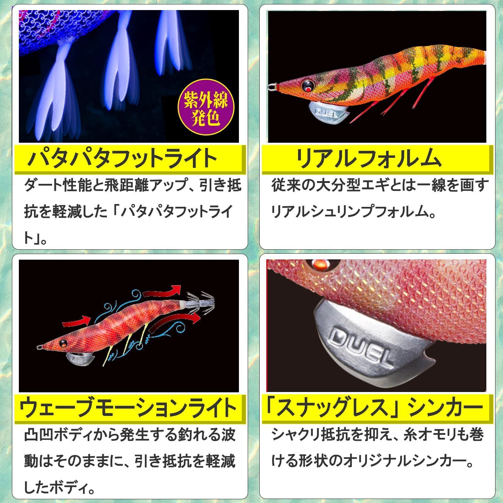 EZ-Qシリーズ史上、最強アピールの色と柄!! ●軽快ダートはそのままに「波動」「色」「音」で高活性のイカに、トリプルアピール!●色:全20色の色がスゴイ!!●音:アピール抜群のエビ音搭載!!●波動:パタパタフットライトの釣れる波動でアピール!!