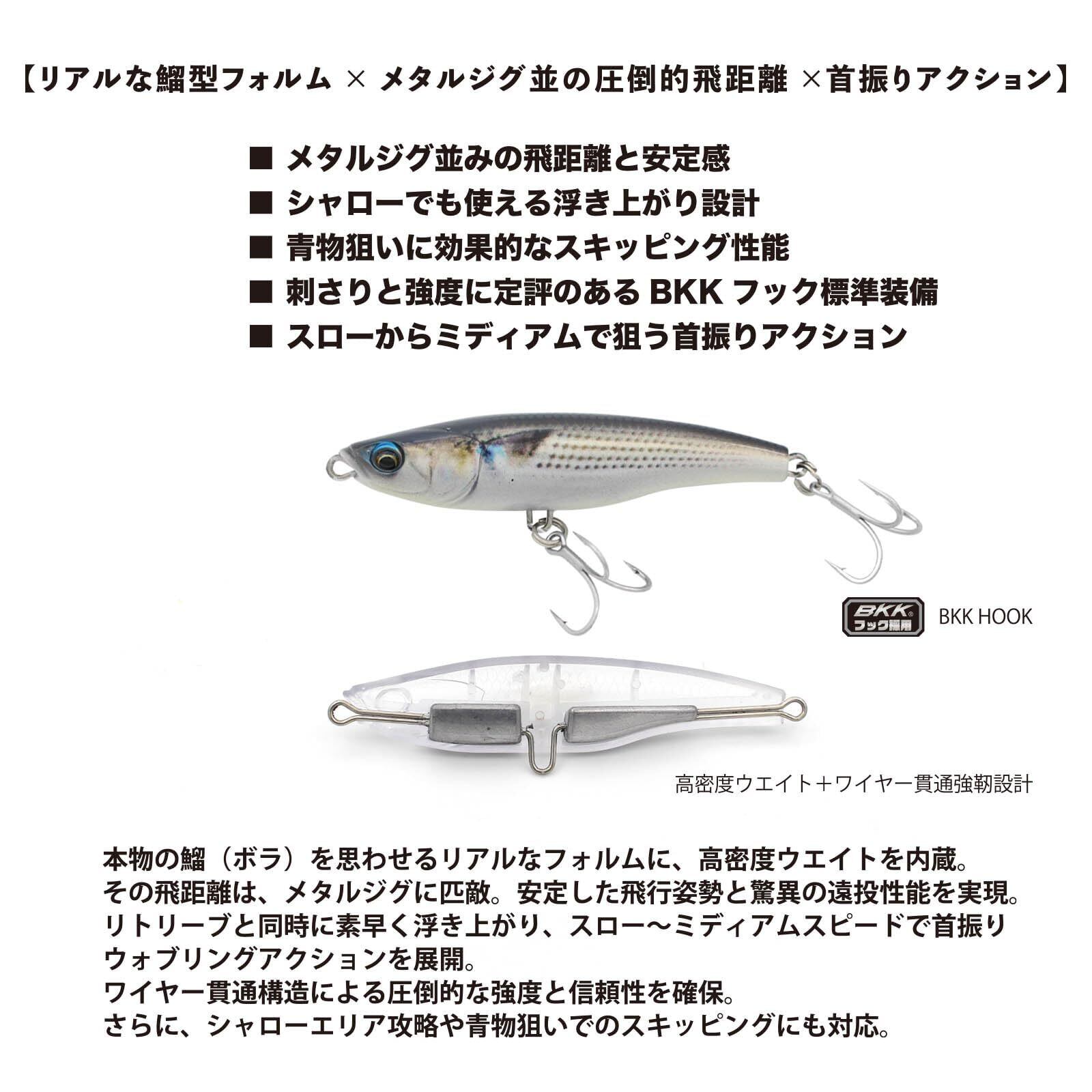 本物の鰡(ボラ)を思わせるリアルなフォルムに、高密度ウエイトを内蔵。その飛距離は、メタルジグに匹敵。安定した飛行姿勢と驚異の遠投性能を実現。リトリーブと同時に素早く浮き上がり、スロー〜ミディアムスピードで首振りウォブリングアクションを展開。ワイヤー貫通構造による圧倒的な強度と信頼性を確保。さらに、シャローエリア攻略や青物狙いでのスキッピングにも対応。