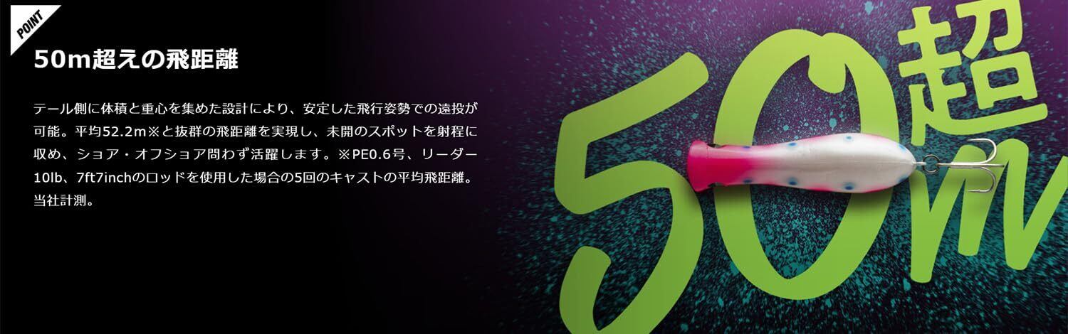 テール側に体積と重心を集めた設計により、安定した飛行姿勢での遠投が可能。抜群の飛距離を実現し、未開のスポットを射程に収め、ショア・オフショア問わず活躍します。