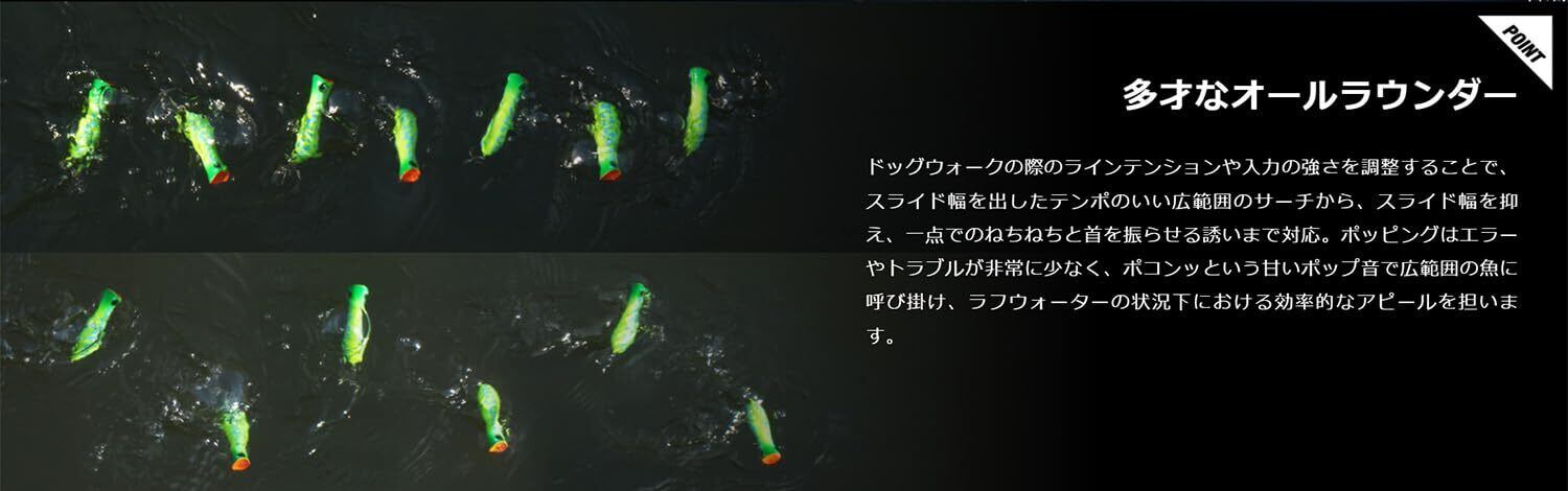 また、アングラーの経験値問わずアクションさせやすく、トップウォータープラグを操る楽しさを体感できます。