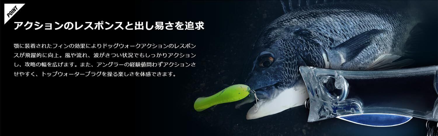 アクションのレスポンスと出し易さを追求し、顎に装着されたフィンの効果によりドッグウォークアクションのレスポンスが飛躍的に向上。