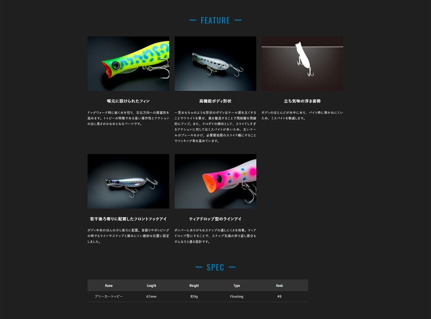 コンセプト:求められる分野が得意分野!! アクションのハイレスポンス性能×安定した飛行姿勢×後方重心設計によるぶっ飛び性能を併せ持つ、クロダイ・チヌ釣り対応のペンシルポッパー!!