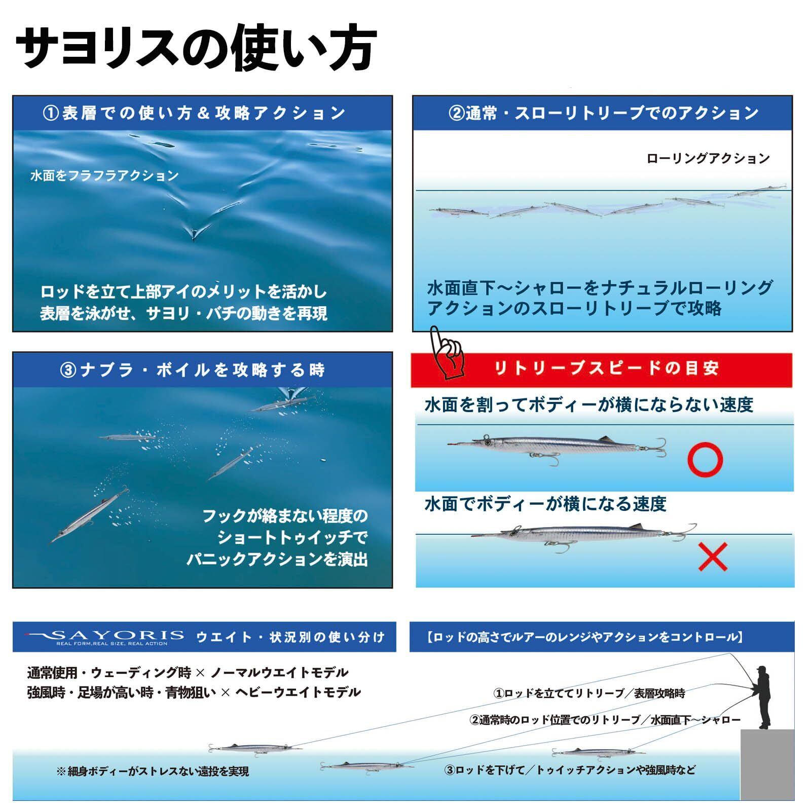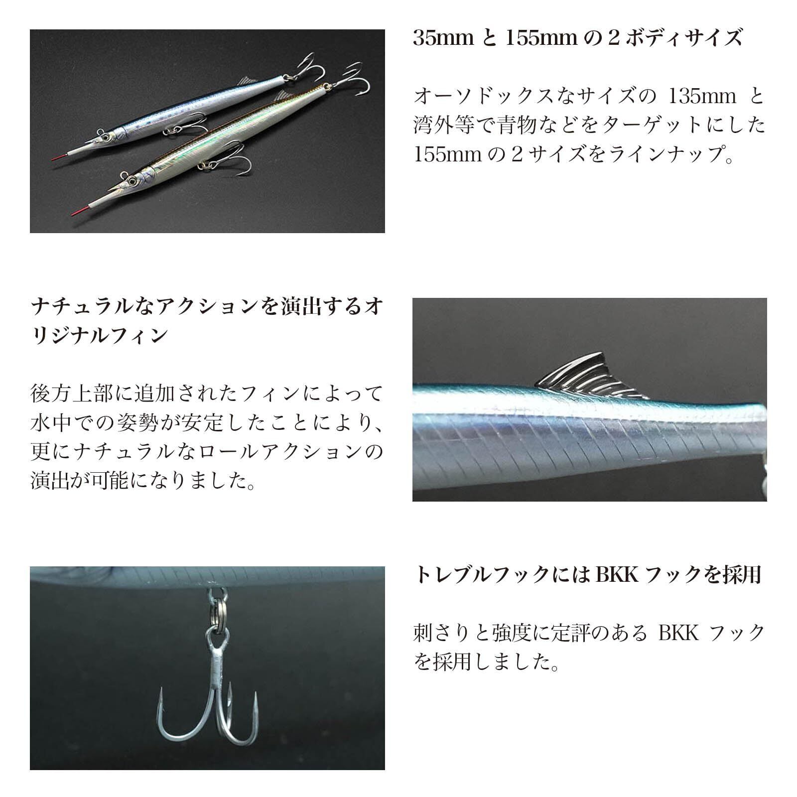 【これにしか穫れない魚が存在する。】圧倒的な釣果を誇る唯一無二のサヨリ型シンキングペンシルがよりリアルにシンフォルム&新サイズで誕生。 ■リアルな見た目はそのままに、更なる釣果につなげるため各部をチューンアップ:ボディ形状は基本ベースはそのままに、よりリアルさを追求。専用形状オモリを再設計する事でバランス調整を実施。ナチュラルなロールアクションに磨きがかかりました。■ロールを主体としたアクション:トレースラインを明確にし、明暗部を確実に攻略できます。更にロッドを立てることでレンジの使い分けができ、表層から群れの下まで対応する高い汎用性を誇ります。■ナチュラルなアクションを演出するオリジナルフィン:後方上部に追加されたフィンによって水中での姿勢が安定したことにより、更にナチュラルなロールアクションの演出が可能になりました。■トレブルフックにはBKKフック:刺さりと強度に定評のあるBKKフックを採用しました。
