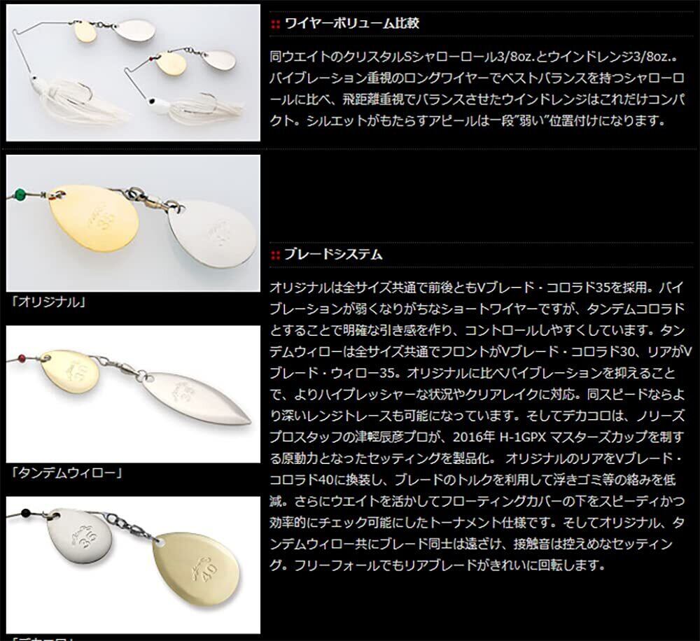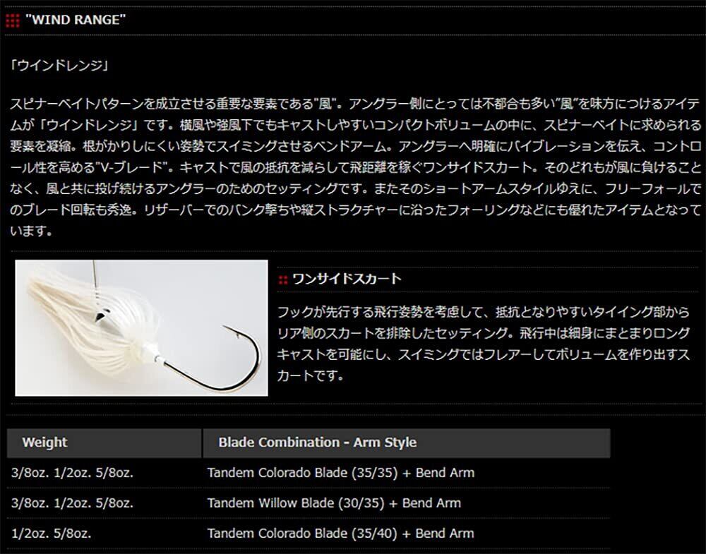ノリーズウインドレンジ タンデムウィロー◆サイズ:5/8ozスピナーベイトパターンを成立させる重要な要素である「風」。アングラー側にとっては不都合も多い”風”を味方につけるアイテムが「ウインドレンジ」です。横風や強風下でもキャストしやすいコンパクトボリュームの中に、スピナーベイトに求められる要素を凝縮。根がかりしにくい姿勢でスイミングさせるベンドアーム。アングラーへ明確にバイブレーションを伝え、コントロール性を高める「V-ブレード」。キャストで風の抵抗を減らして飛距離を稼ぐワンサイドスカート。
