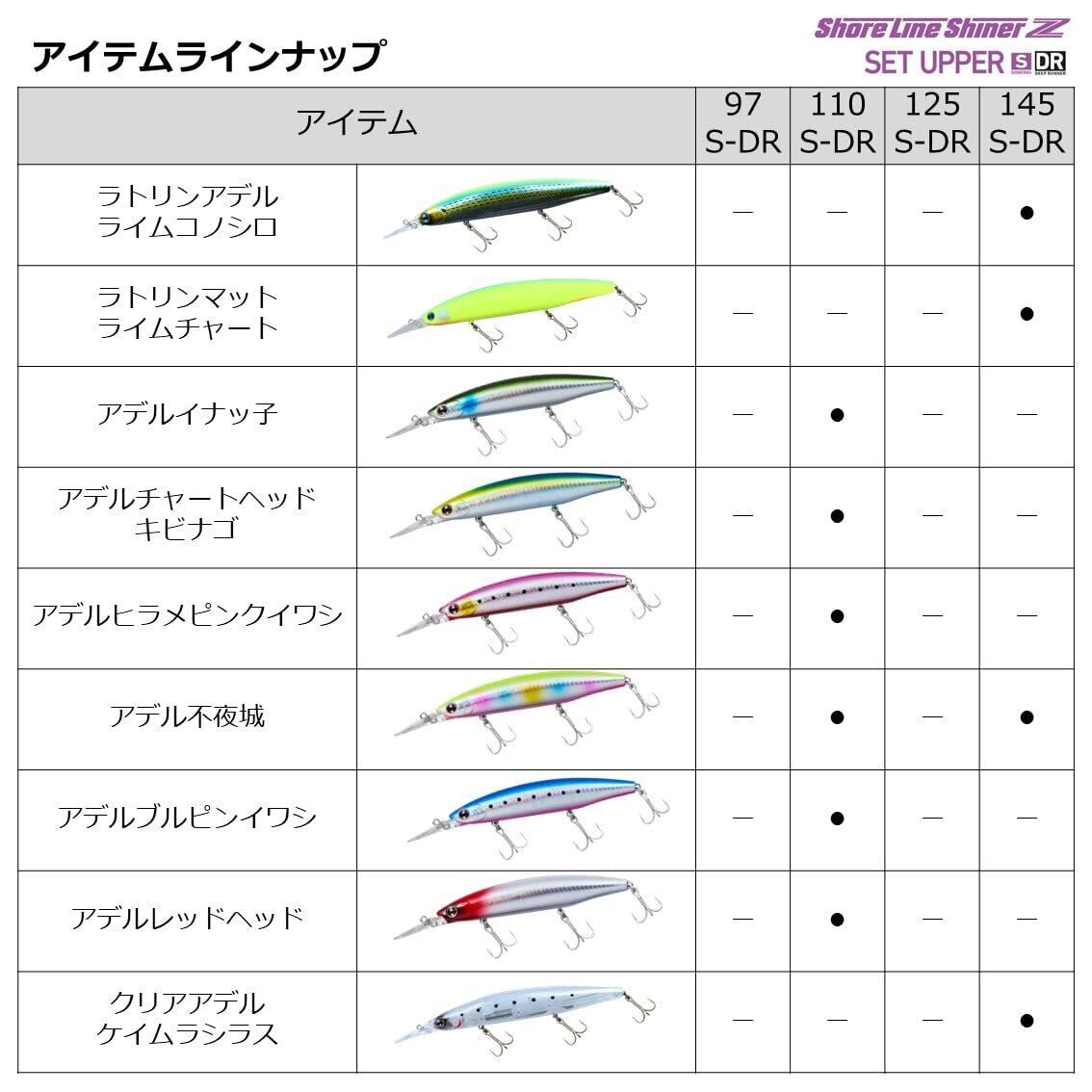 DAIWA/ダイワショアラインシャイナーZ セットアッパー 125S-DR◆全長:125mm◆重量:26g◆潜行レンジ:MAX 2m over◆アクション:ハイピッチ タイトウォブンロール◆飛距離:最大79.5m◆フック仕様:ST-46 #6×3/リング #3小沼正弥完全監修。テッパンだけでは芸が無い、誰もが苦手にしている堤防、磯等における中層と足元を攻められるぶっ飛びサーチシンキングダイバーキャスタビリティ・レンジキープ性能を追求したスローシンキング設定ながら、多用するスロー~ミディアムでのレスポンスを徹底追求。小沼の卓越した経験とフィールドテストを繰り返した末にたどり着いた、こだわりの「釣れるハイピッチタイトウォブンロールアクション」が持ち味。「タダ巻きのスローリトリーブ」でもしっかりした引き心地と強烈なフラッシング&波動を発生。また、流れの変化で自動的に生まれるイレギュラースライドアクションが食わせの間を与え、特別なロッドアクションの入力は不要。低活性でシビアなシーバスのキスバイト(口先でつつくようなバイト)にも対応するこだわりの3本フックシステム採用。