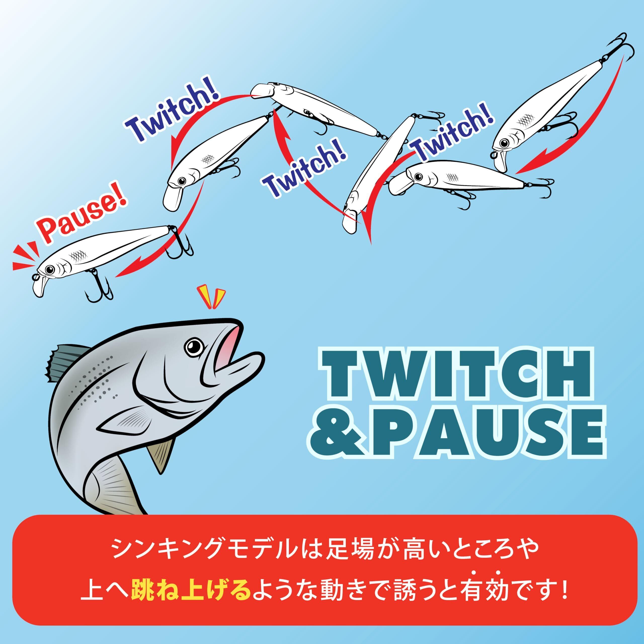 ■ 基本アクションと応用 スローリトリーブ 魚がルアーをじっくり追える速度で巻き、自然なローリングを演出。 ストップ&ゴー 地形変化やベイト反応のある場所で一瞬止め、食わせの間を作る。 ジャーク&ポーズ 軽くロッドを煽って不規則な動きを入れ、反射的に喰わせる。