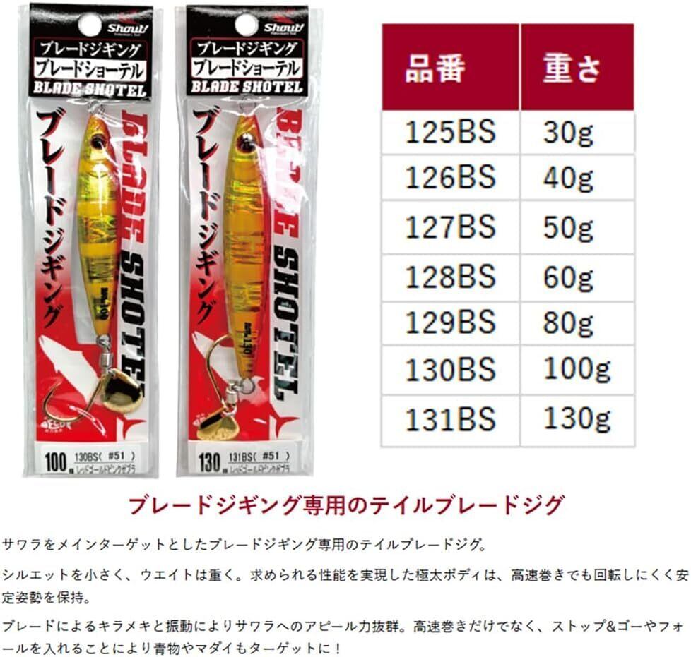 シャウト!ブレードショーテル!!ブレードジギング専用のテイルブレードジグ!サワラをメインターゲットとしたブレードジギング専用のテイルブレードジグ。シルエットを小さく、ウエイトは重く。求められる性能を実現した極太ボディは、高速巻きでも回転しにくく安定姿勢を保持。ブレードによるキラメキと振動によりサワラへのアピール力抜群。高速巻きだけでなく、ストップ&ゴーやフォールを入れることにより青物やマダイもターゲットに!