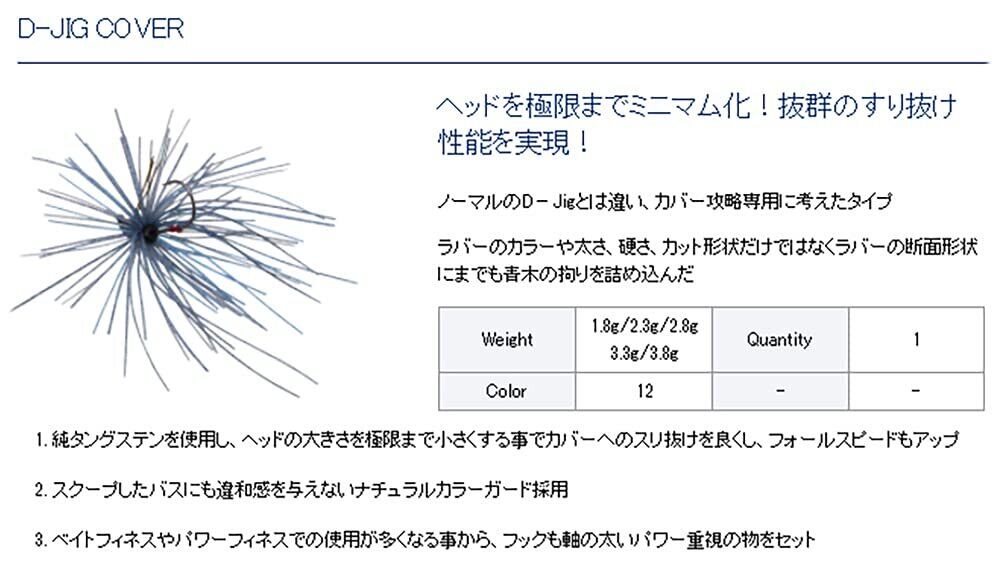 「DSTYLE ルアー D-JIG COVER 3.3g」は、バスフィッシングを楽しむ全てのアングラーに向けた軽量設計の高性能ジグです。特に、ハイギアロッドとの相性が抜群で、様々な釣り方に適した大きなアドバンテージを持っています。