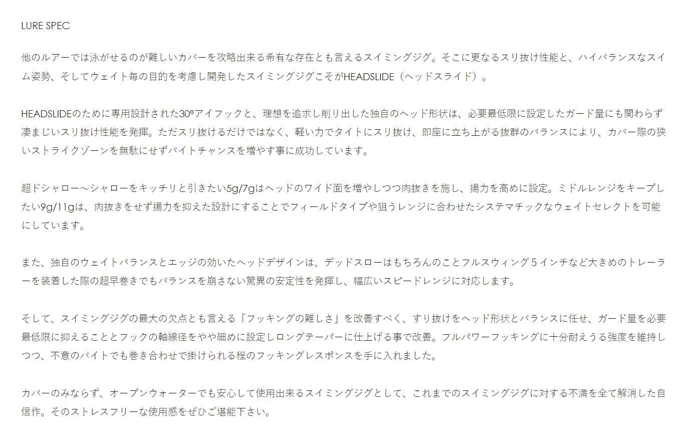 そこに更なるスリ抜け性能と、ハイバランスなスイム姿勢、そしてウェイト毎の目的を考慮し開発したスイミングジグこそがHEADSLIDE(ヘッドスライド)。