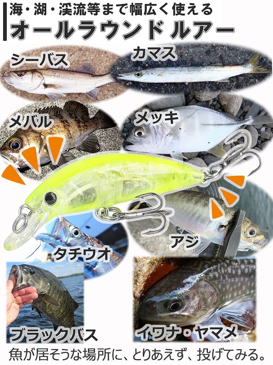 【幅広く使える】海・湖・川まで汎用性が高いライトゲーム用ミノー。/アジ、メッキ、カマスなどソルトから、ブラックバス、トラウトまで汎用性が高いサイズ感です。