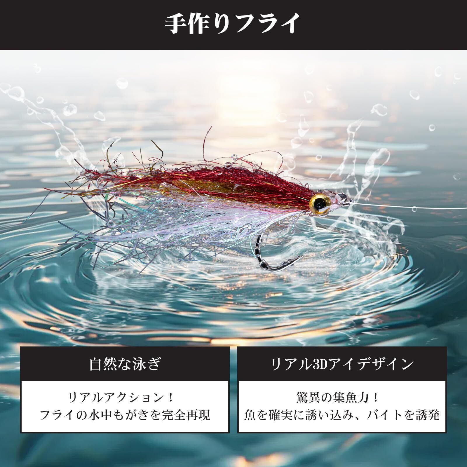 【それぞれ異なるリアルな泳ぎの動き】3種類のフライがそれぞれ独自の泳ぎを再現し、抜群の誘魚力を発揮。ベイトフィッシュ・ストリーマーは素早く自然な遊泳を模倣したダブルフック装備でフッキング率向上、ウーンデッド・ミノーは不規則なもがき動作で好奇心旺盛な魚や活性の低い魚を効果的に誘引、クレイジー・チャーリーは高速点滅動作で視認性が高く広範囲の探査を可能にします。