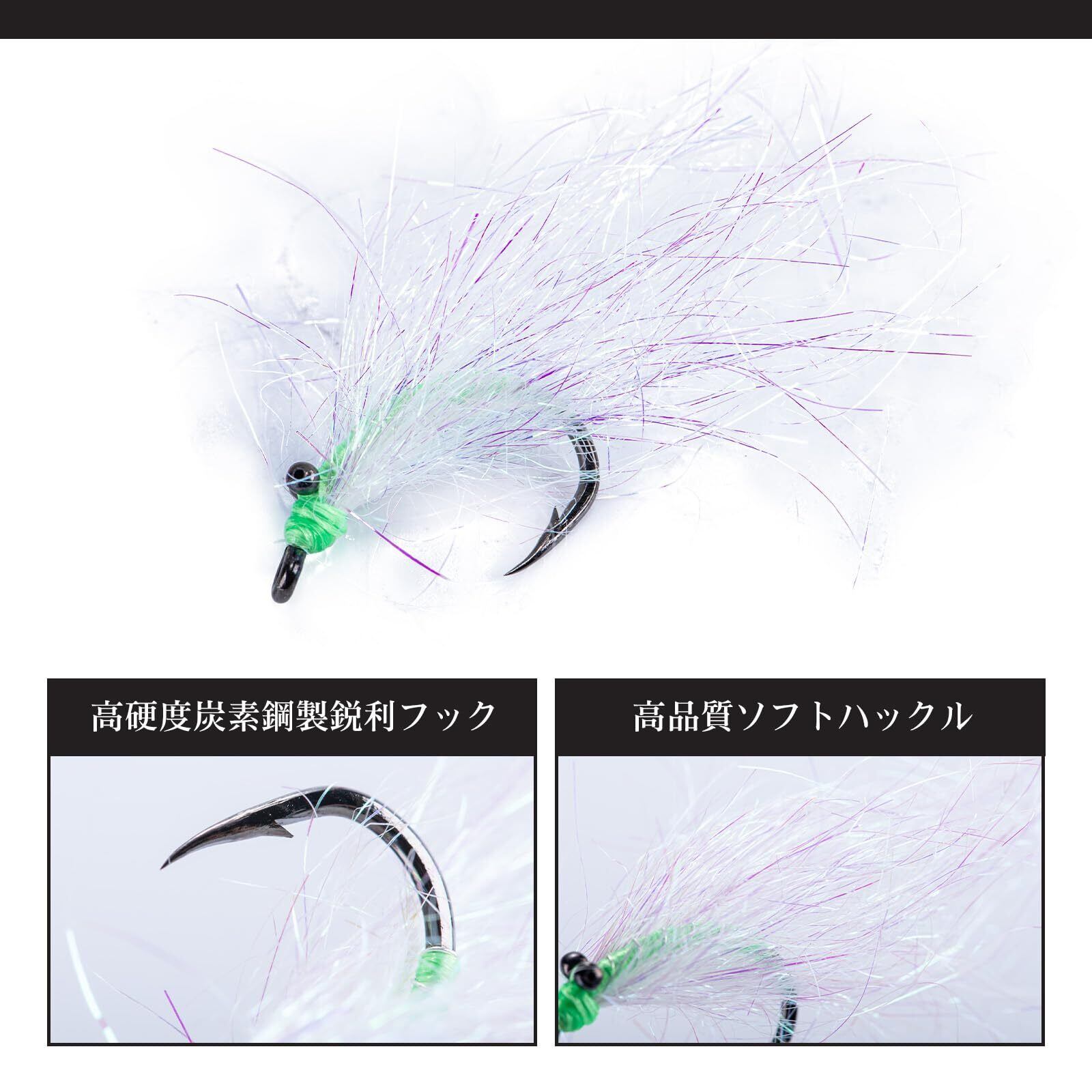 【高品質な素材】高強度高炭素鋼+高密度ポリマーファイバー採用、発色性に優れ退色しにくいカラー、研ぎ澄まされた針先が抜群の貫通力を発揮、タッチした瞬間に確実なフッキングを実現。