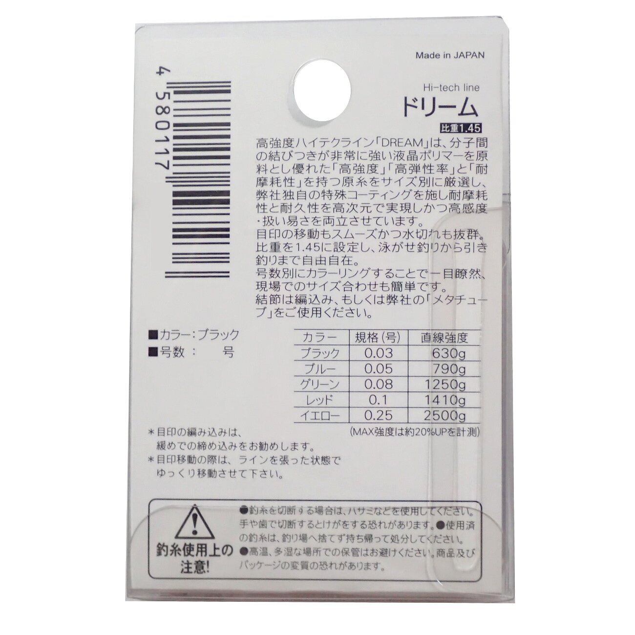 高強度ハイテクライン「DREAM」は、分子間の結びつきが非常に強い液晶ポリマーを原料とし優れた「高強度」「高弾性率」と「耐摩耗性」を持つ原糸をサイズ別に厳選し、独自の特殊コーティングを施し耐摩耗性と耐久性を高次元で実現しかつ高強度・扱い易さを両立させています。