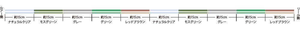 「クリア、モスグリーン、グレー、グリーン、レッドブラウン」を15cm間隔で配色している。