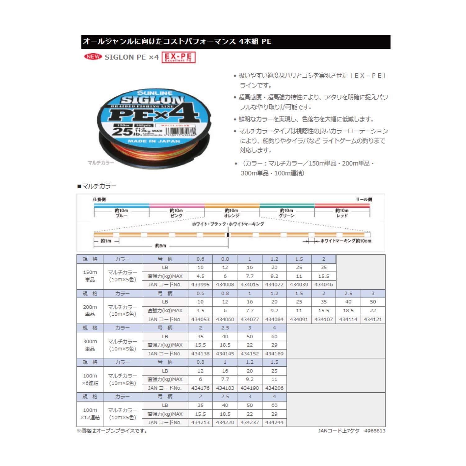 シグロンPE×4 (マルチカラー)! ! オールジャンルに向けたコストパフォーマンス4本組PE! ! ●扱いやすい適度なハリとコシを実現させた「EX-PE」ラインです。●超高感度・超高強力特性により、アタリを明確に捉えパワフルなやり取りが可能です。●鮮明なカラーを実現し、色落ちを大幅に低減します。●マルチカラータイプは視認性の良いカラーローテーションにより、船釣りやタイラバなどライトゲームの釣りまで対応します。