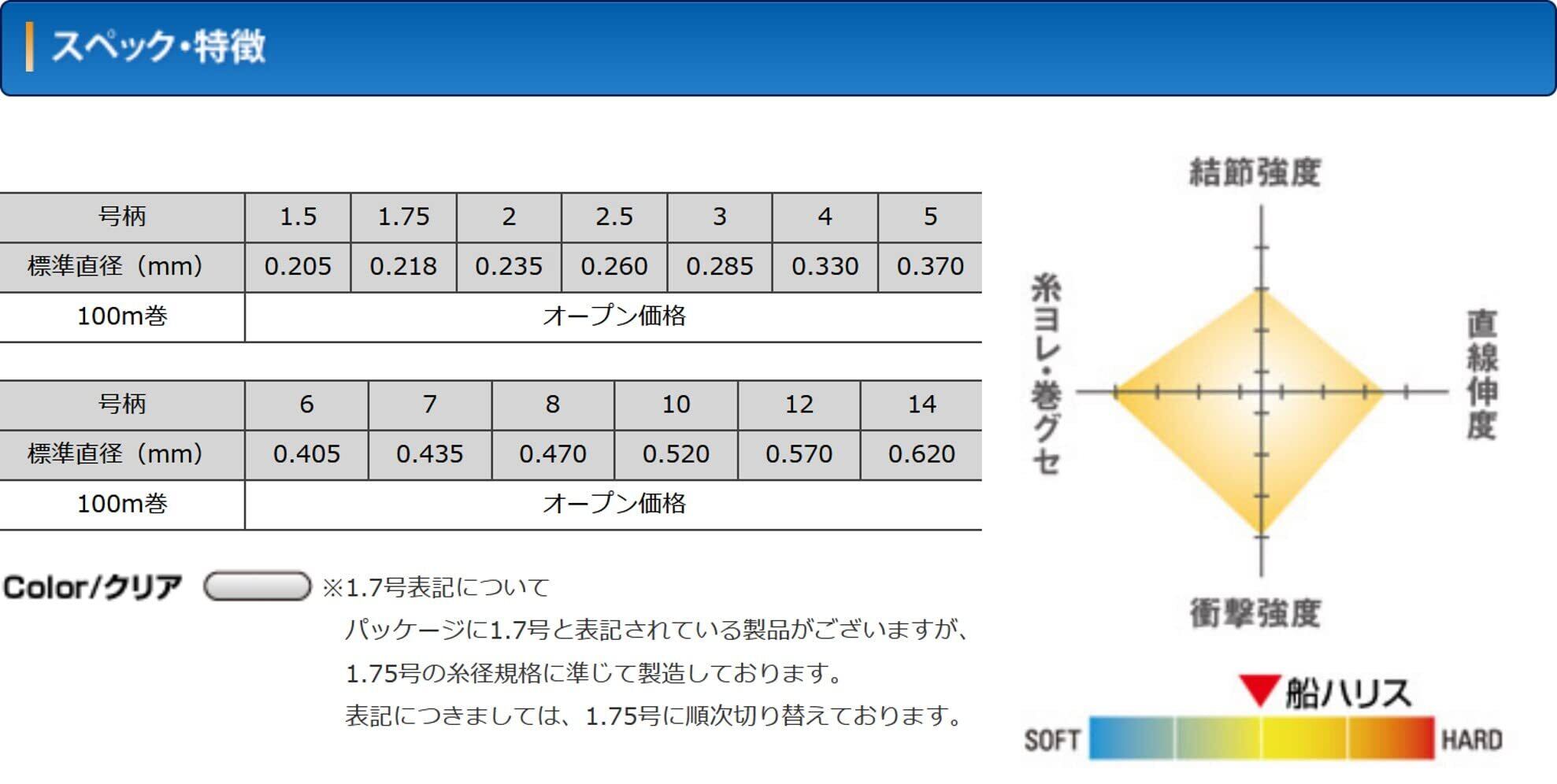 ■水に溶けるような透明感。耐摩耗性に優れた、クリスタルクリアの船専用フロロハリス。「強さ」と「しなやかさ」の絶妙なバランスを持った船専用ハリス。大口径スプールと高い撥水性で実現した、糸さばきの良さ。水に近い屈折率のクリアラインで、水中のカモフラージュハリスを演出します。また、極めて低い吸水性で、長時間の水中使用でも高強度を維持します。