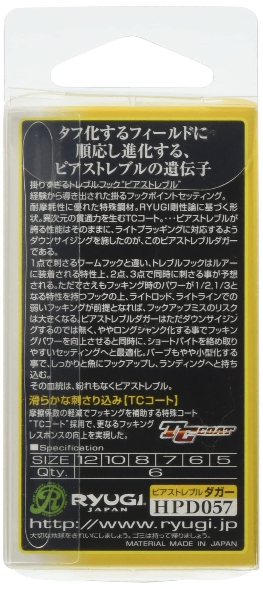 Ryugi/リューギ PIERE TAEBLE/ピアストレブル TCコート DAGGER/ダガー◆サイズ:6/7/8/10/12◆入り数:6本フックで釣果は、こんなにも変わる。タフ化するフィールドに順応する、ピアストレブルの遺伝子!掛りすぎるトレブルフック、ピアストレブル!経験から導き出された掛るフックポイントセッティング。対摩耗性に優れた特徴鋼材。RYUGI剛性論に基ずく形状。異次元の貫通性を生むTCコート。・・・・ピアストレブルが誇る性能はそのままに、ライトプラッギングに対応するようダウンサイジングを施したのが、このピアストレブルタガーである。1点で刺さるワームフックと違い、トレブルフックはルアーに装着される特性上、2点.3点で同時に刺さることが予想される。ただでさえもフッキング時のパワーが1/2.1/3となる特性を持つフックの上、ライトロッド、ライトラインでの弱いフッキングが前提となれば、フックアップミスのリスクは大きくなる。