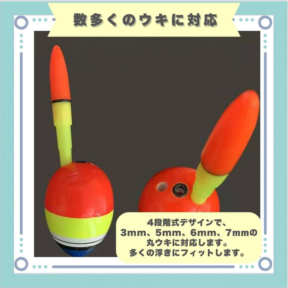 【数多くのウキに対応】4段階式デザインで、3mm、5mm、6mm、7mmの丸ウキに対応します。多くの浮きにフィットします。