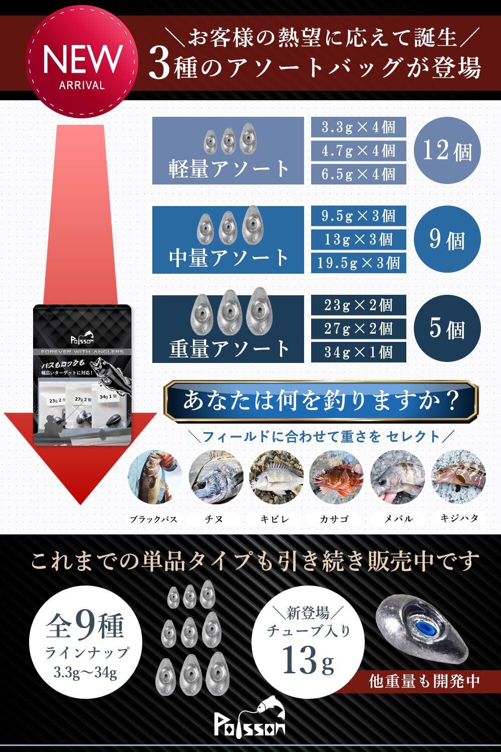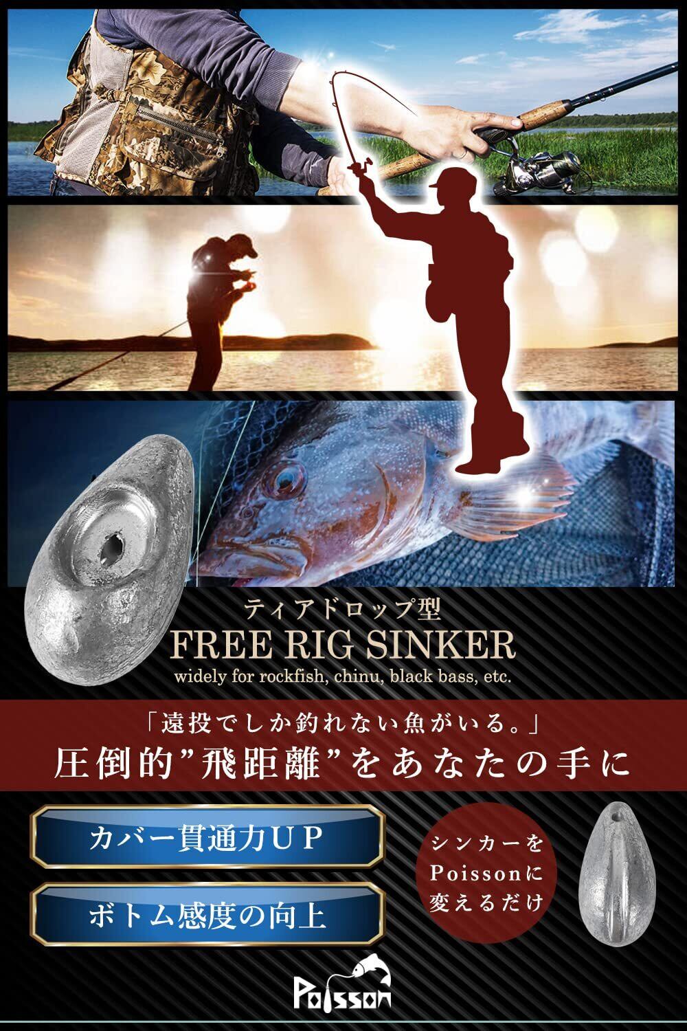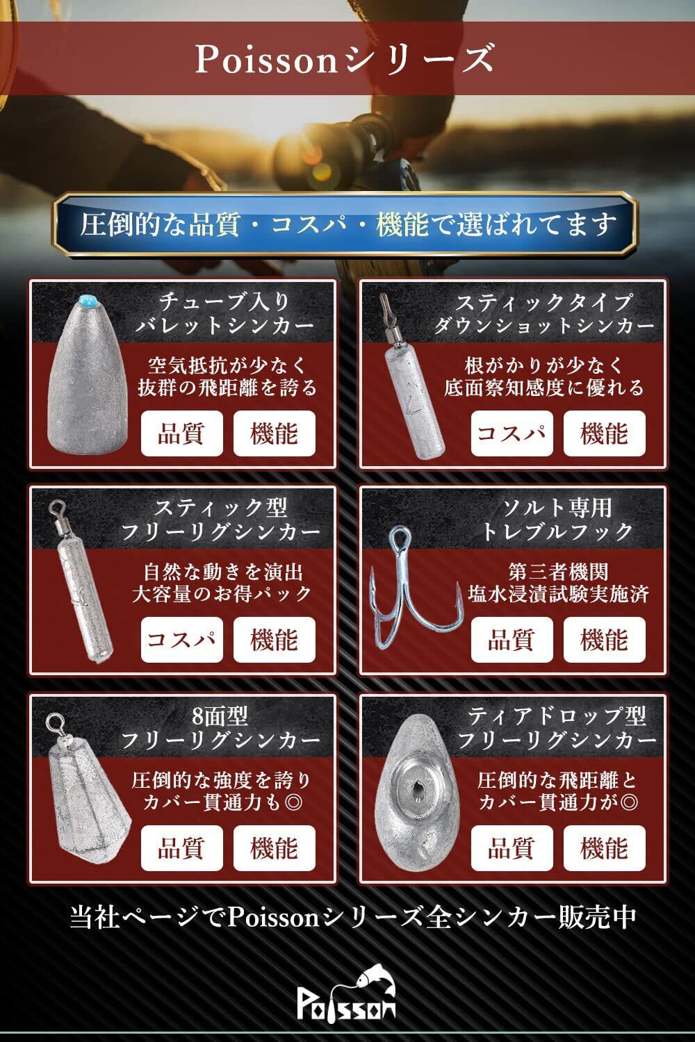 Poissonよりティアドロップ型フリーリグシンカーの登場。ティアドロップ型で貫通力を向上し、遠投に強い。背面スリットにより海底等での不要な転がりを抑制。根掛かりリスクを低減します。 ブラックバスやロックフィッシュなどにも対応したヘビーウェイトもラインナップ。様々なシーンに応じて使い分けください。 このシンカーで皆様が大物を釣り上げることを心より願っております。