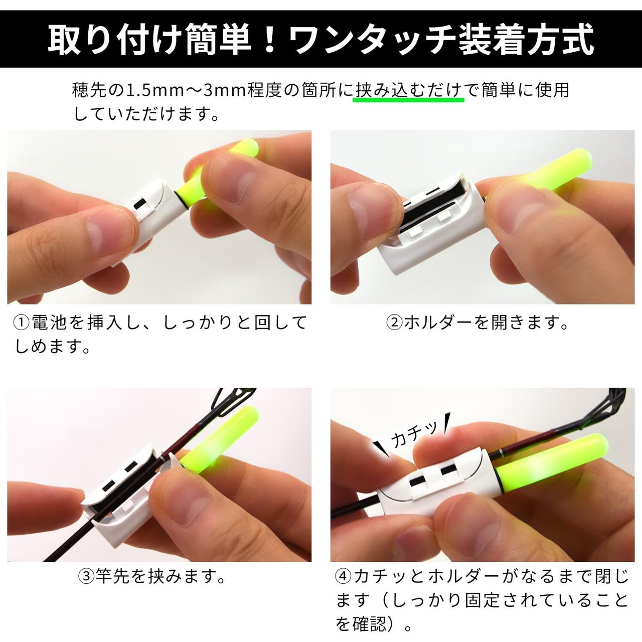 【ワンタッチ装着方式でつけ外し簡単】ワンタッチ装着方式を採用しており、穂先の1.5mmから3mmの程度の箇所に挟み込むだけで簡単に使用していただけます。