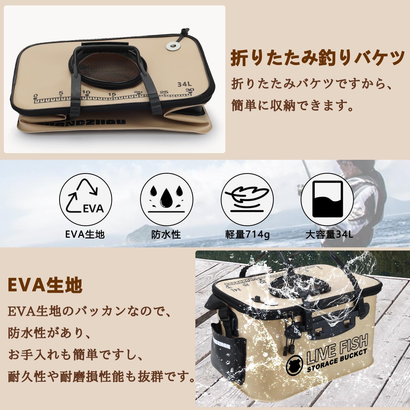 【軽くて頑丈な高品質EVA素材】柔軟性抜群のEVA採用で、繰り返し折りたたみOK。重量約700-800gと軽量ながら、耐磨耗・防水性に優れ、釣り場の過酷な環境でも耐久性を発揮。