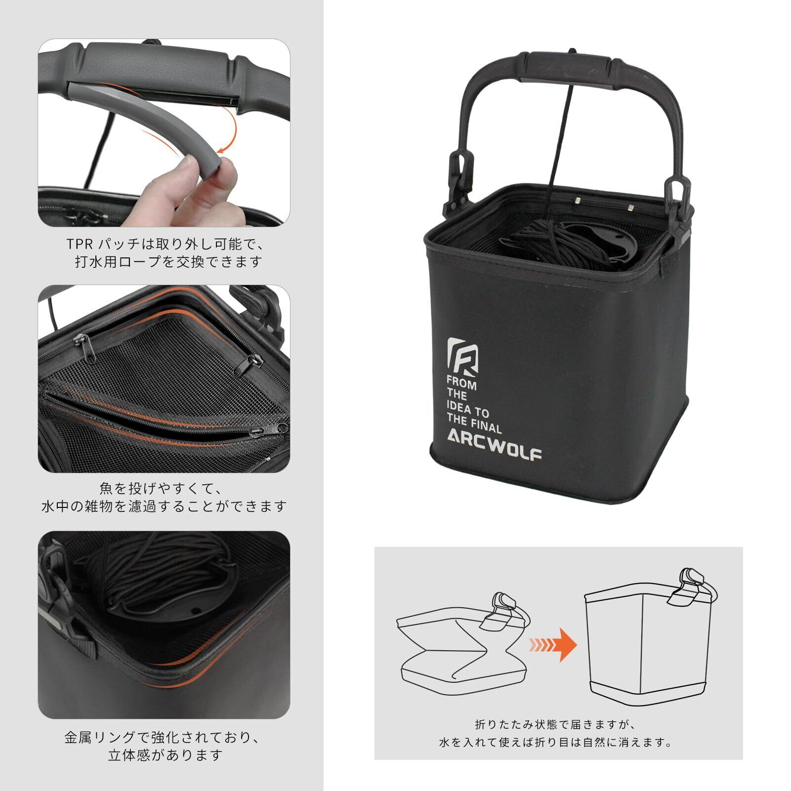 【人間工学に基づく】:ハンドルの下に肌触りがいいTPRパッチを設計しており、手のひらにフィットして握る感じが良いです。8mの水中用ロープも付属し、深水での使用に適します。使う場合に持ちやすく、固定しやすく、使用の安全性が改善しました。更にバケツにフィルターネット蓋と双方向ジッパーを備えて、魚が見えやすい同時に、魚が逃げることを防止します。また、ジッパーが閉じる場合に水を入れて、効果的に雑物を濾過して、きれいな水質を確保します。