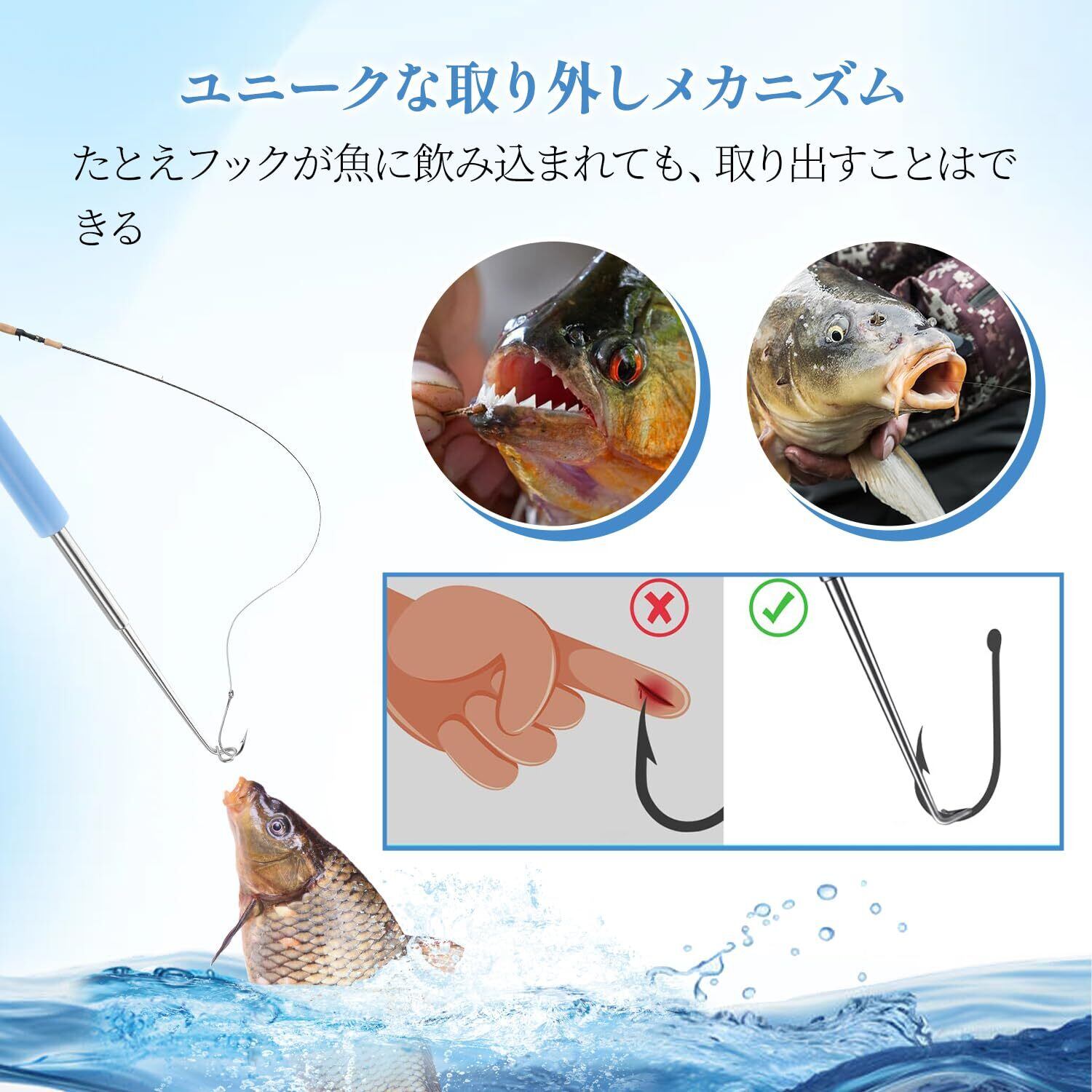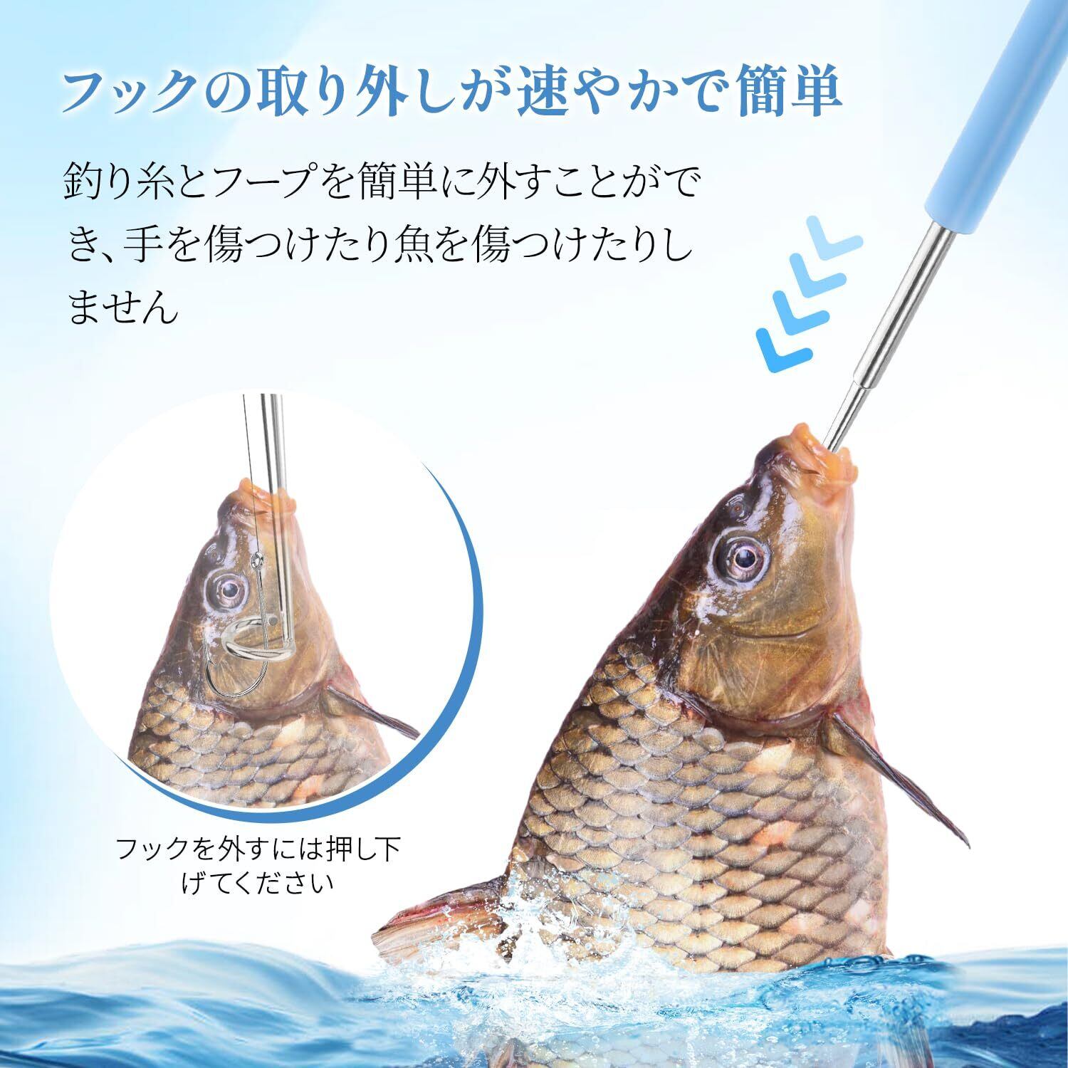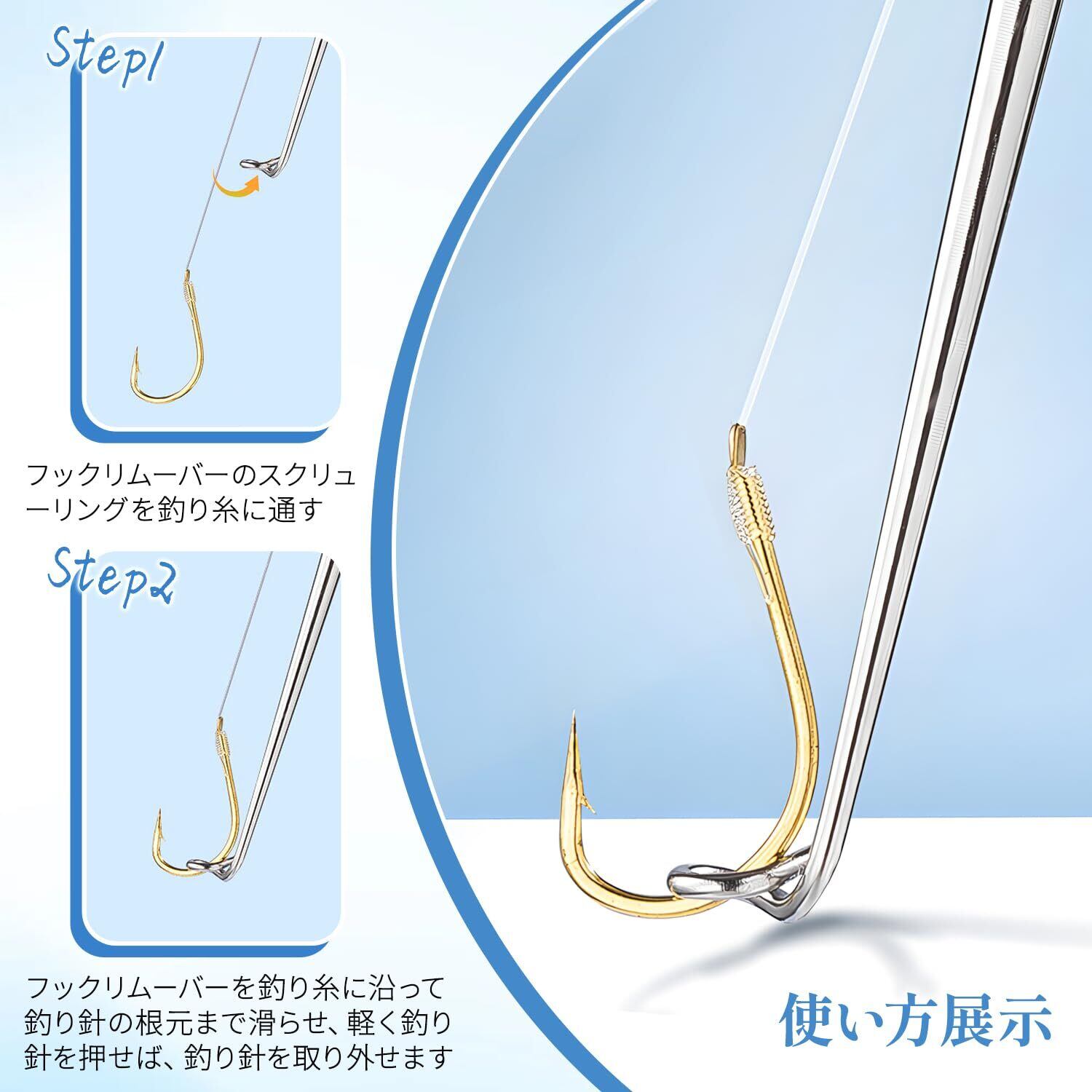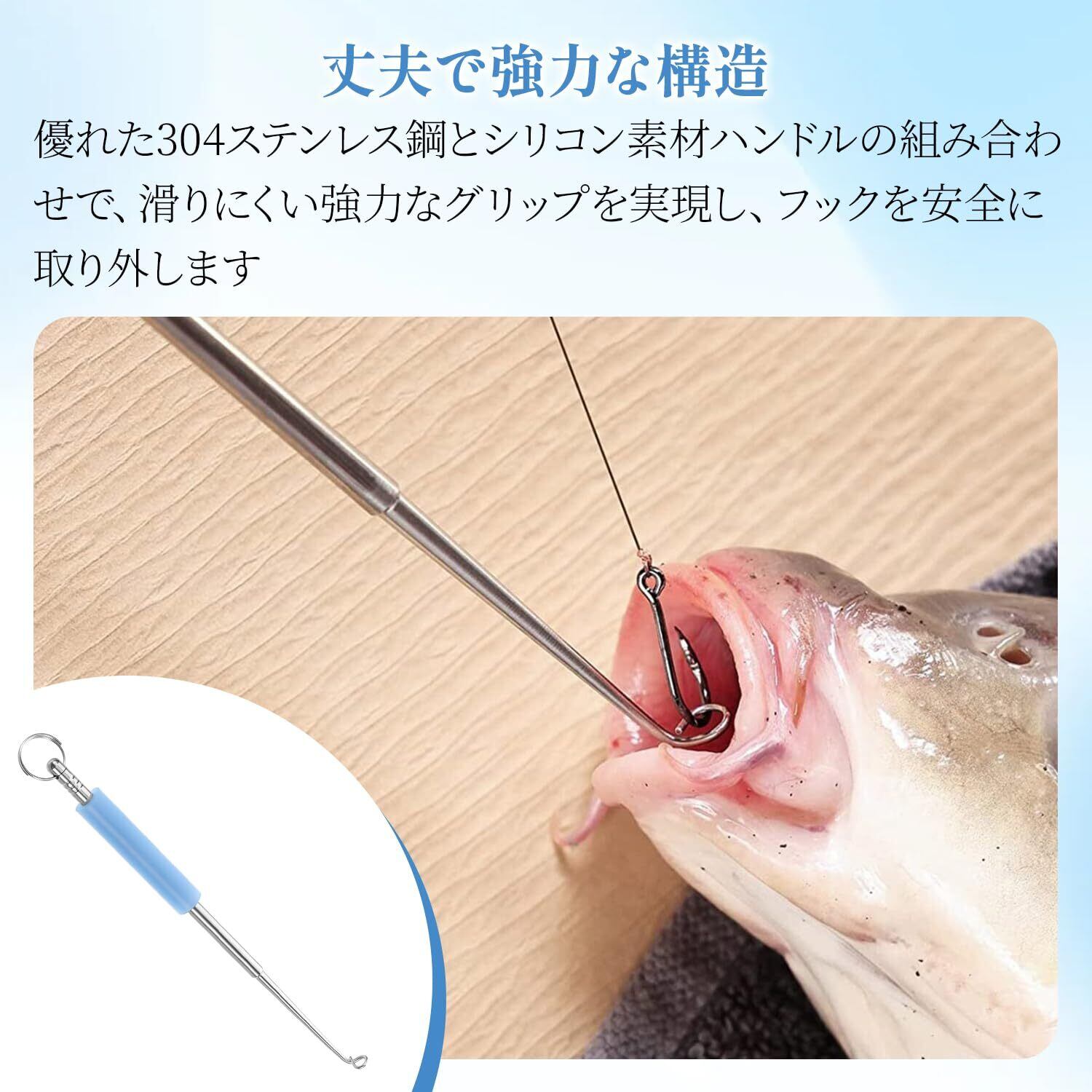 ✨【ワンステップで簡単操作】魚の口にツールを挿入するだけで、素早く安全にフックを外せます。手間のかかる手作業から解放され、釣りに集中できる時間が増えます。