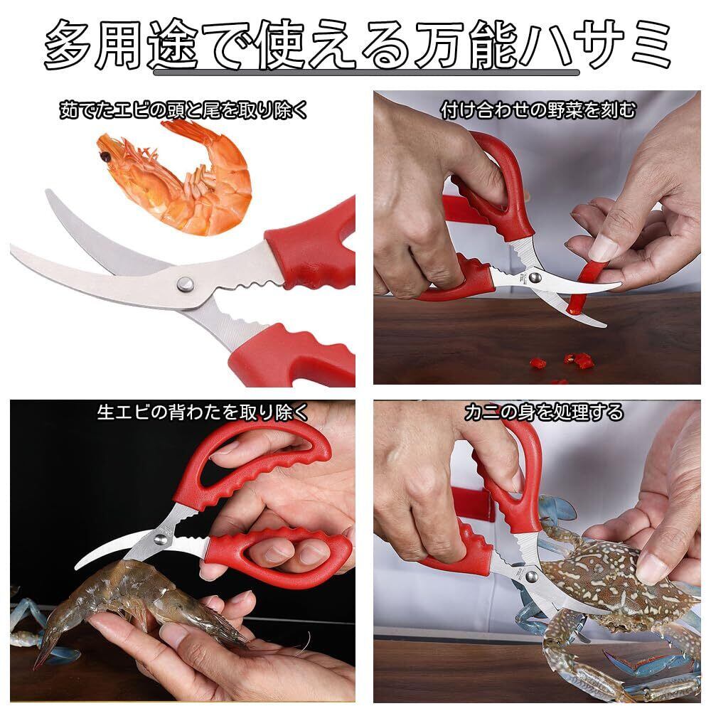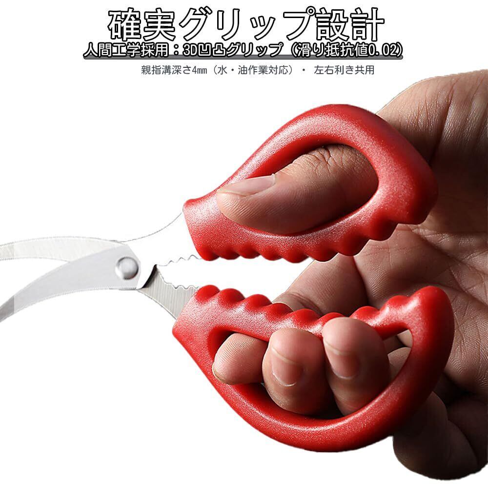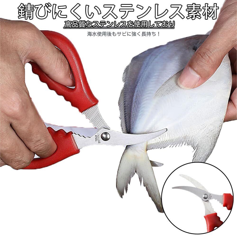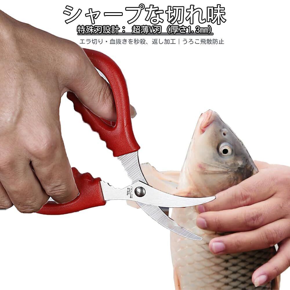 【パッケージ内容】 魚処理用ハサミ×2本(黒/赤各1) ▼ サイズ:15×8×1.2cm(手掌収納可能) 【シャープな切れ味】 ▼ 特殊刃設計: 超薄V刃(厚さ1.3mm)|エラ切り・血抜きを秒殺、返し加工|うろこ飛散防止 ▼ 処理速度:アジ3枚おろし:38秒(従来品比40%短縮) 【 錆びにくいステンレス素材】 高品質なステンレスを使用しており、海水使用後もサビに強く長持ち! 【4機能マルチツール】 エラ取り:フック形状先端|1動作で完遂 血抜き:脊髄切断専用窓付き 鱗落とし:刃裏の微細鋸歯で除去 糸切り:根元切断溝(耐荷重20kg) 【確実グリップ設計】 ▼ 人間工学採用: ・ 3D凹凸グリップ(滑り抵抗値0.02) ・ 親指溝深さ4mm(水・油作業対応) ・ 左右利き共用 【多用途で使える万能ハサミ】 魚の放血、鰓部の切除、腹部の開腹、筋の除去、切り分けなど、このツールはあらゆる作業に対応可能です。