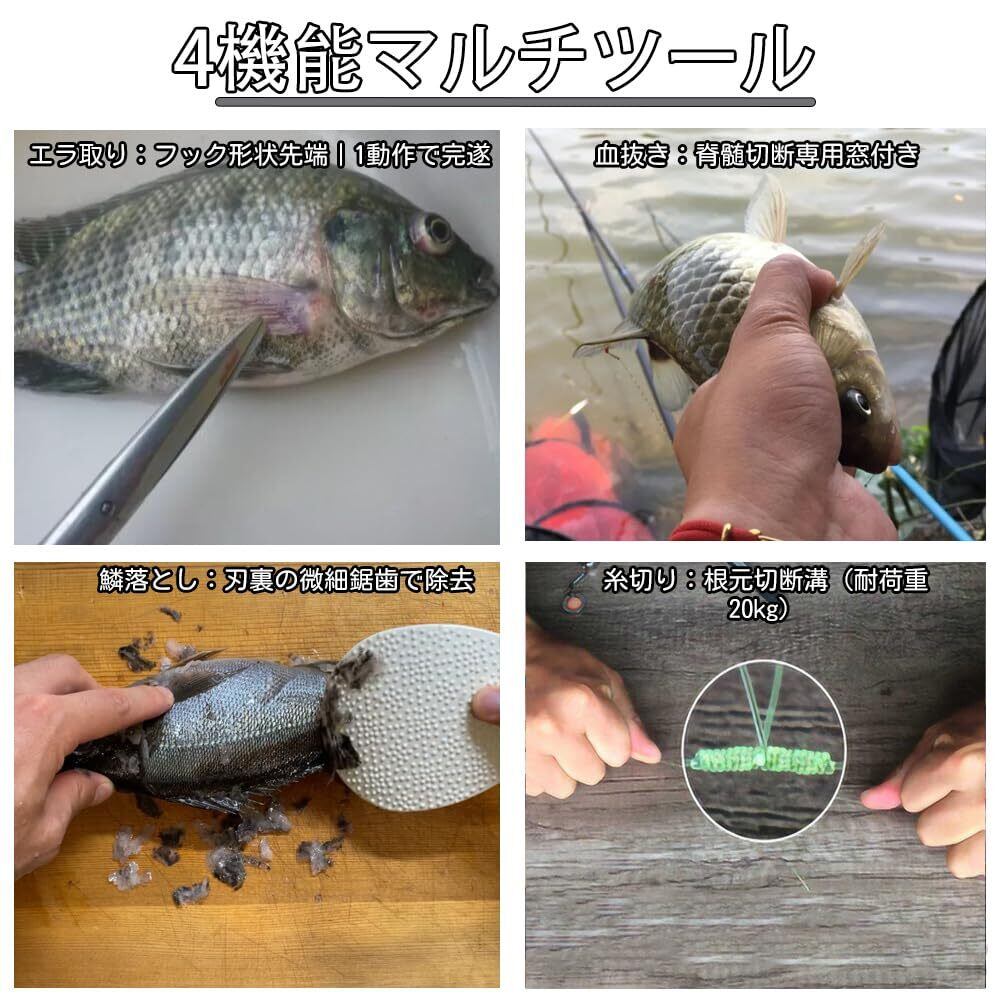 【4機能マルチツール】 エラ取り:フック形状先端|1動作で完遂 血抜き:脊髄切断専用窓付き 鱗落とし:刃裏の微細鋸歯で除去 糸切り:根元切断溝(耐荷重20kg)