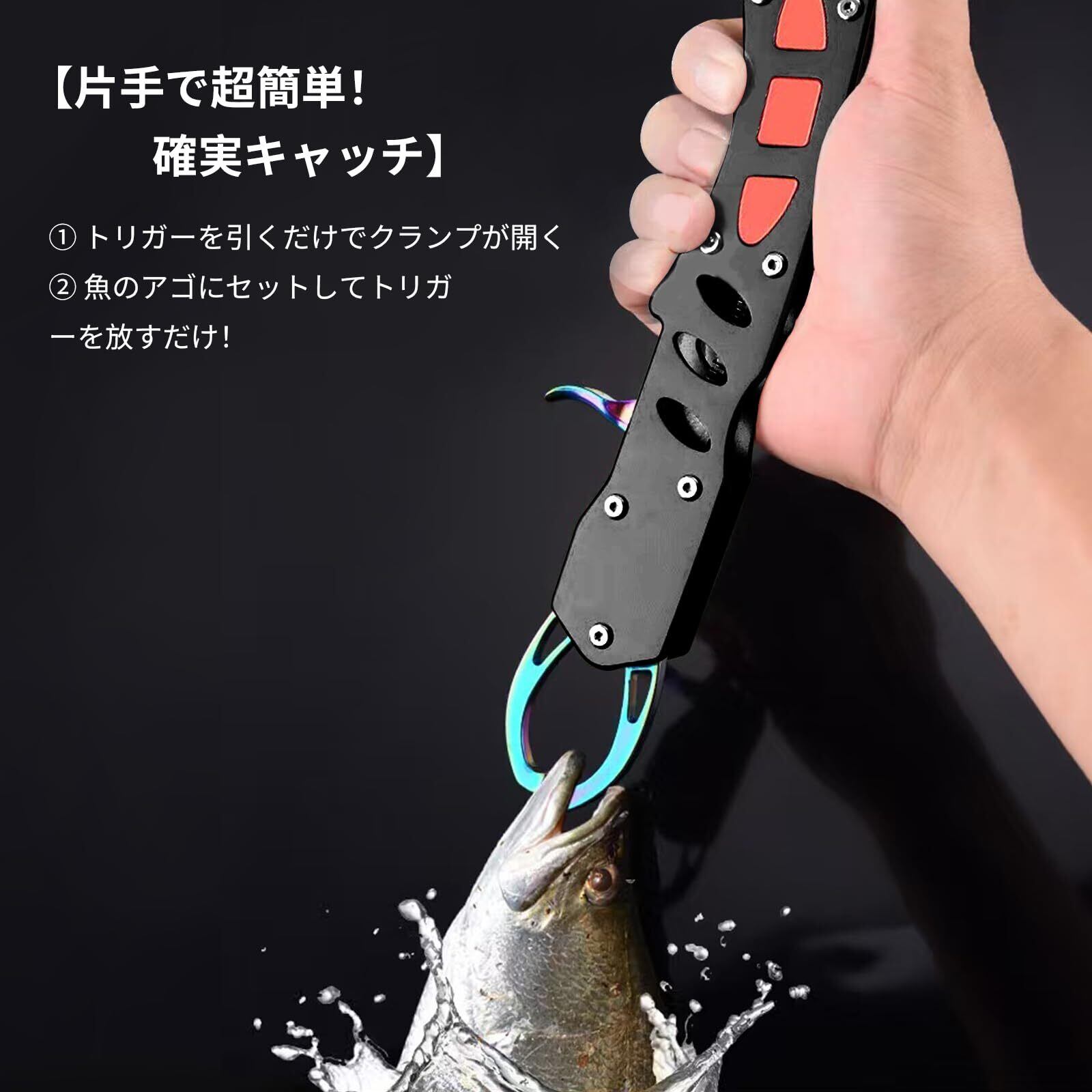 片手で超簡単!確実キャッチ。① トリガーを引くだけでクランプが開く② 魚のアゴにセットしてトリガーを放すだけ!これだけで強力にロックし、魚を確実にホールドします。滑り止め加工で安全かつ、軽量設計で疲れにくい。
