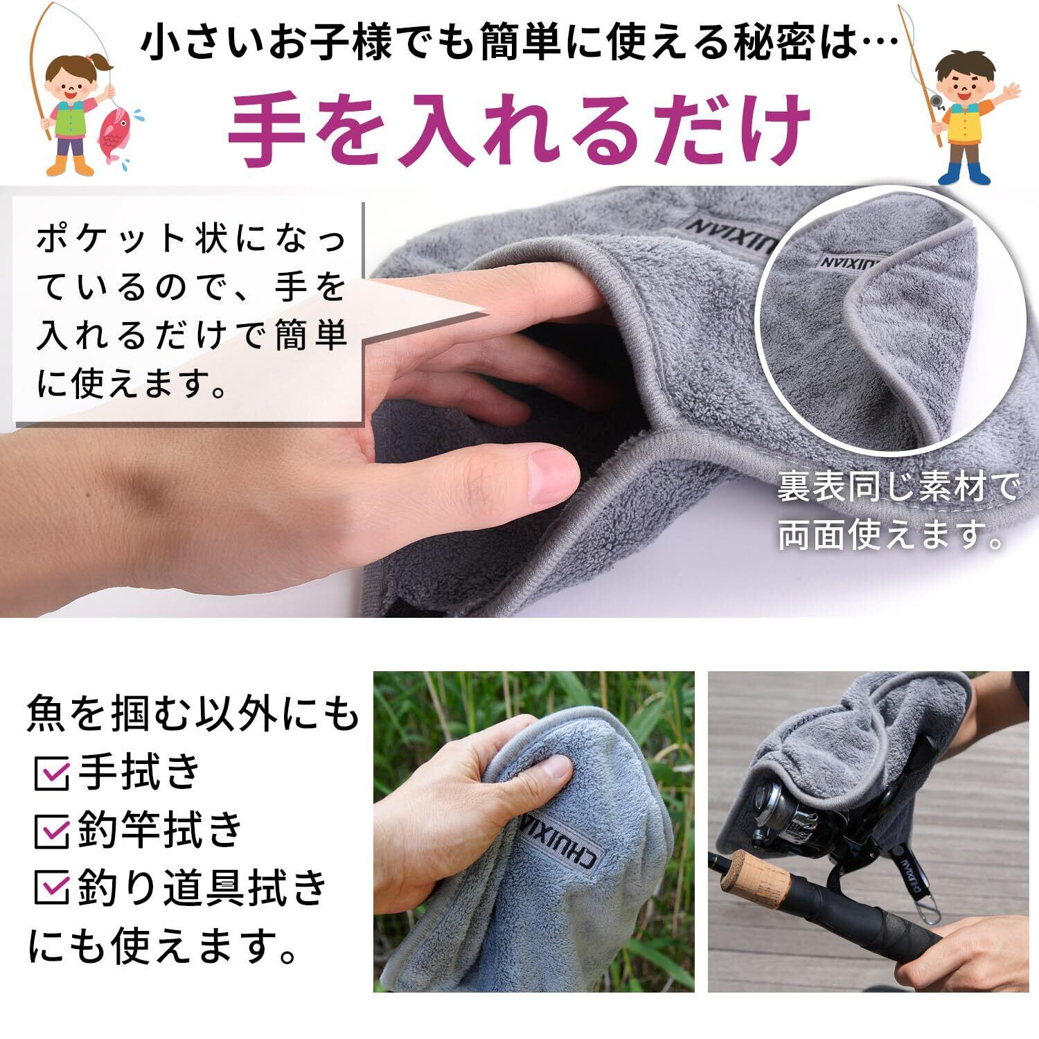 【手を入れるだけで魚を簡単につかめる】タオルは袋状になっており中に手を入れられる設計になっているので手袋のように使用することができて便利です。魚をつかみやすい形状になっています。大型の魚をつかんだり魚を締める際にも使えます。柔らかいタオル素材なので小さなお子様でも簡単に使用できます。
