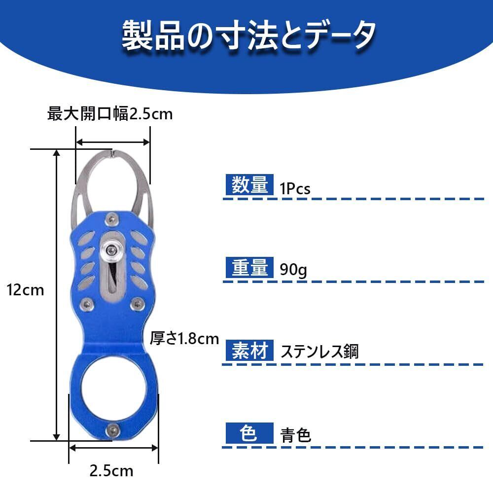 ステンレス鋼製の釣り用ツール(1 個入り、90g)。青色で、最大開口幅 2.5cm、全長 12cm、厚さ 1.8cm。内蔵式フック、開閉スイッチ、固定クリップ、伸縮式ストラップ付き。釣りの際の魚の取り扱いに最適で、様々な釣りシーンで活躍します。