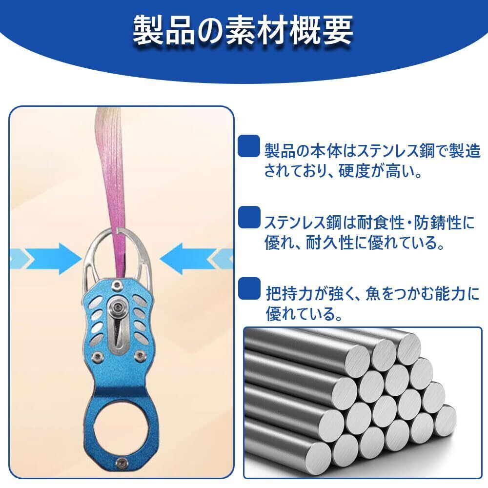【製品素材】 本体:ステンレス鋼(硬度が高く、耐食性・防錆性に優れ、耐久性に優れる。把持力が強く、魚を確実につかめる)。長期間の使用や水濡れにも強く、釣り愛好者に最適な素材です。