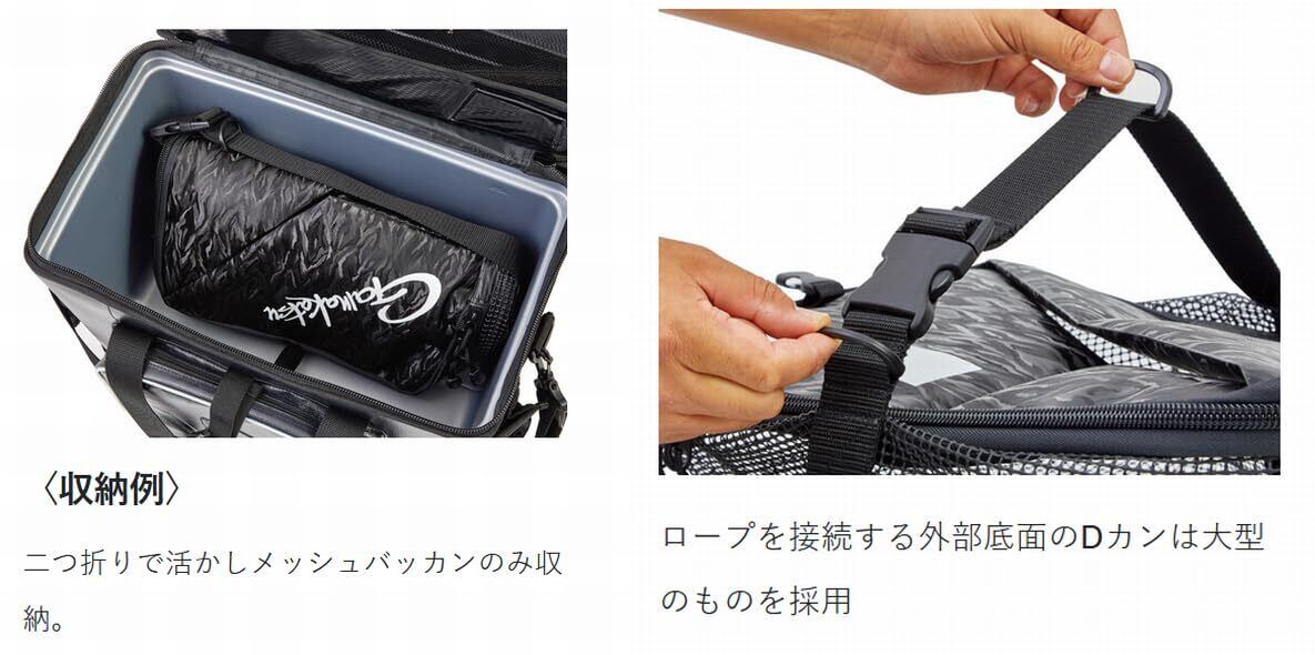 内部のメッシュ素材は樹脂コーティングで内部の魚へのダメージを軽減。本体とロープを接続する外部底面のDカンは大型のものを採用し、耐久性をアップ。オモリを接続することで浅場でもしっかりと内容量を確保。
