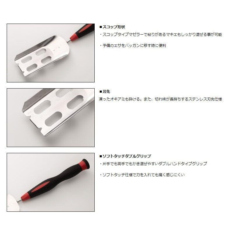 スコップ形状:スコップタイプマゼラーで粘りがあるマキエもしっかり混ぜる事が可能。予備のエサをバッカンに移す時に便利。