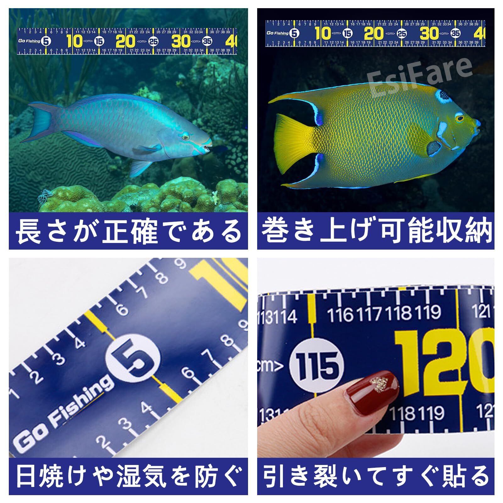 【高品質の素材】自己粘着魚定規の表面には紫外線防止コーティングが施されており、海水による腐食に強く、屋外で長期間使用しても色褪せません。雨の日や水しぶきなどの湿気の多い環境でも目盛りは鮮明で、測定が妨げられることなく長寿命です。強力な粘着剤付きの裏面設計により、滑らかな表面から粗い表面までしっかりと固定できます。