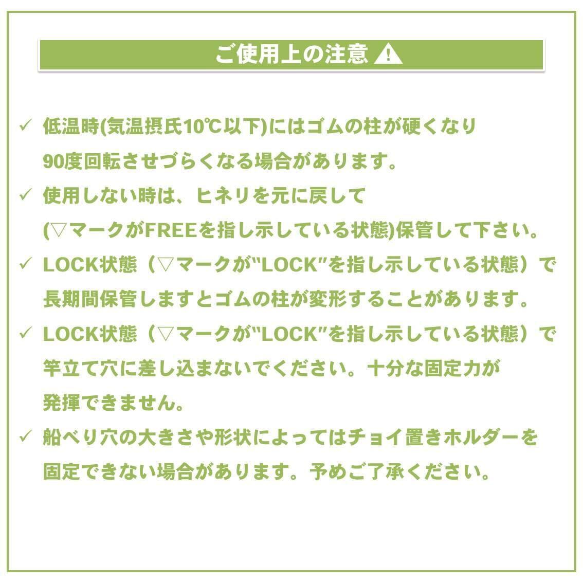 ●竿掛け部を90度ヒネると、船べり穴に挿入する部分が変形し固定力が強まり脱落防止になります。(90度回転させる)●船べり穴の大きさや形状によってはチョイ置きホルダーを固定できない場合があります。予めご了承ください。