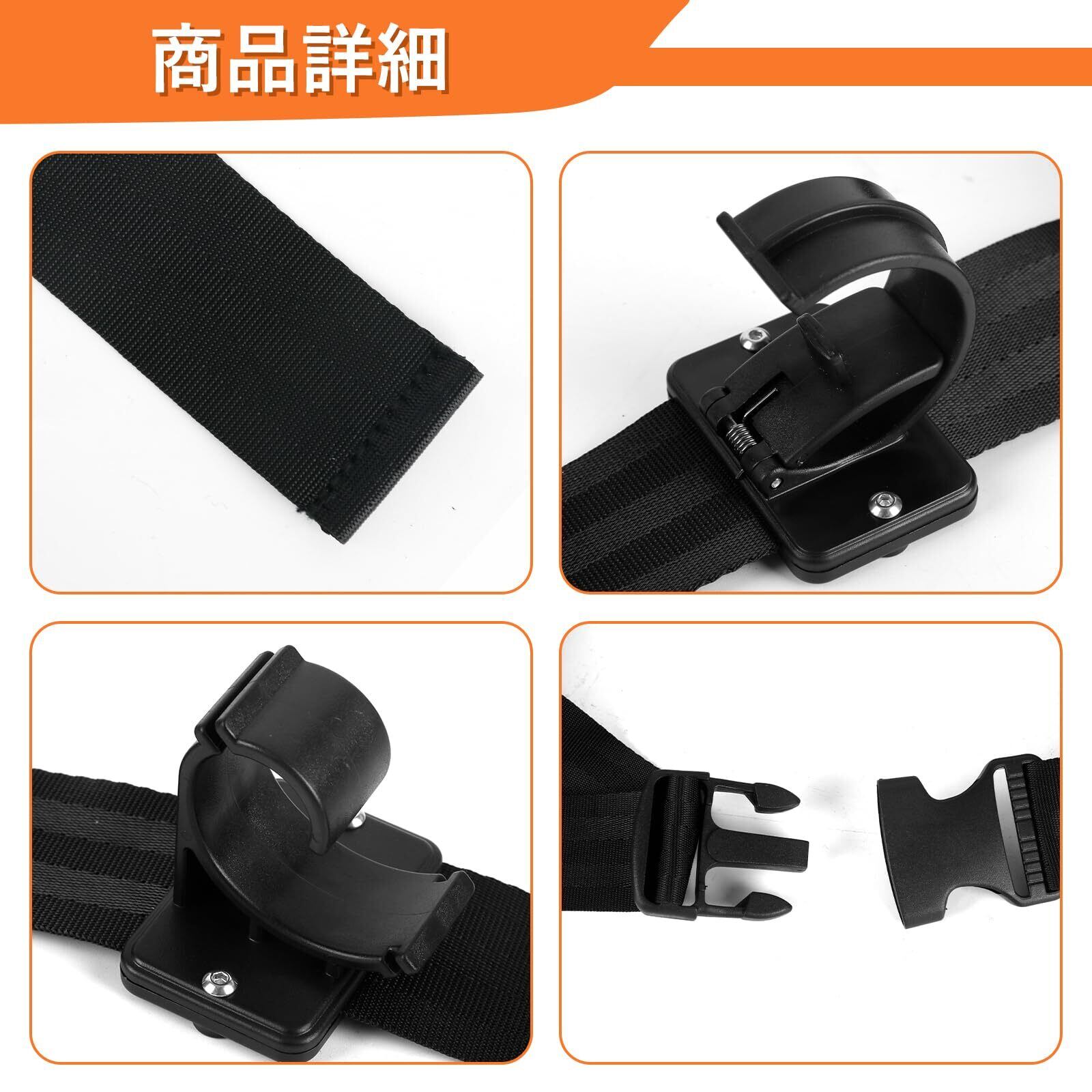 【こだわりポイント】この車載ロッドホルダーの最大の特徴は、自動車シートベルトと同素材の高強度伸縮ストラップ2本と12個の特殊クランプを採用していることです。この独自設計により、最大6本の釣り竿やコンボロッドを車内でしっかり固定でき、どんなに悪路を走行しても全くぐらつきません。