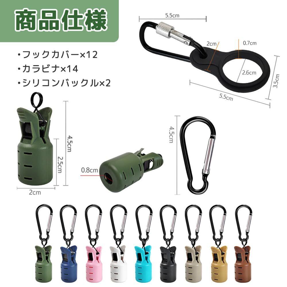 1.【充実の12点セットでコスパ抜群】フックカバー×12、カラビナ×14、シリコンバックル×2。フックカバー寸法:45mm×20mm。余分なパーツを常備できるため、釣り場での急な交換や紛失時も安心。家族や仲間とのシェアにも便利です。