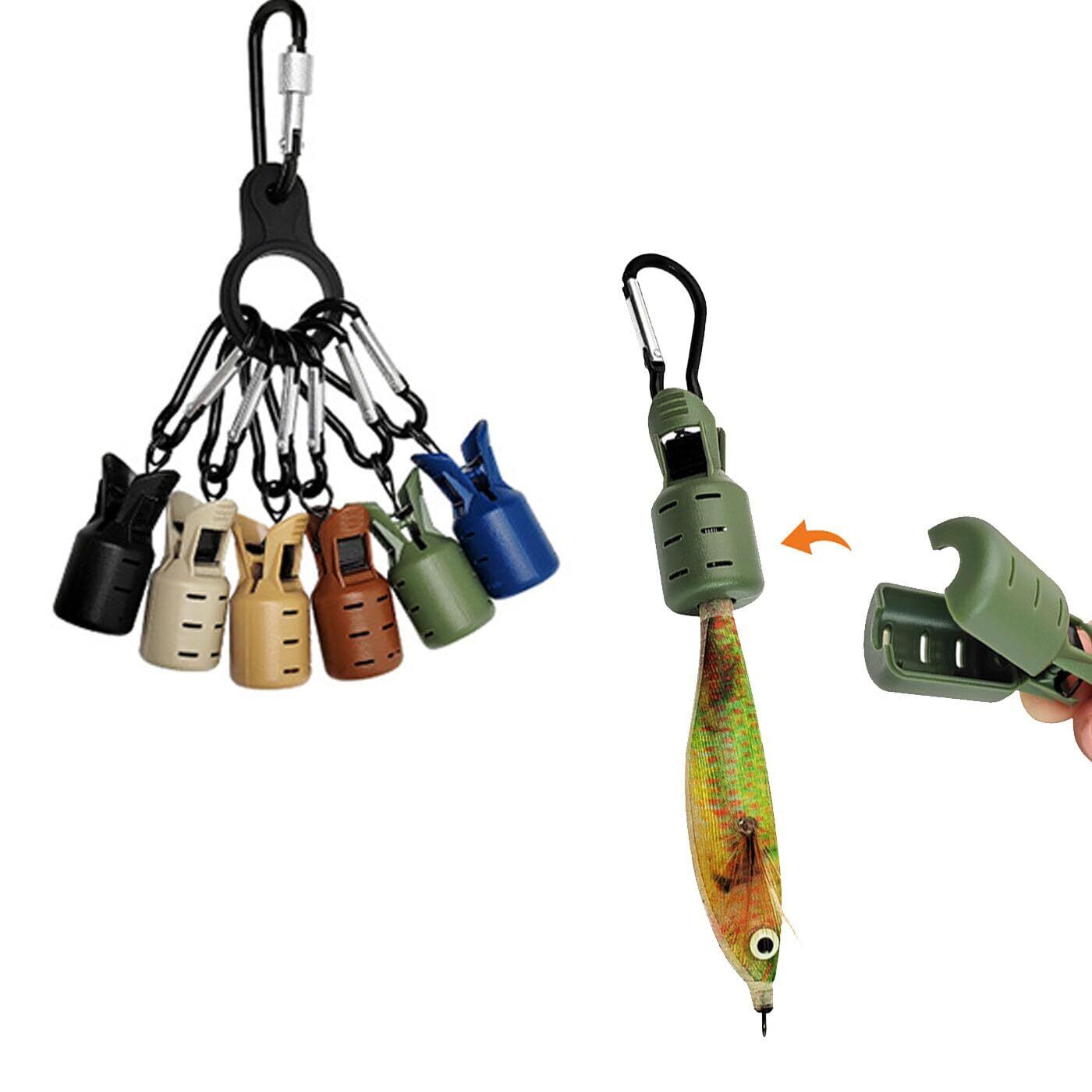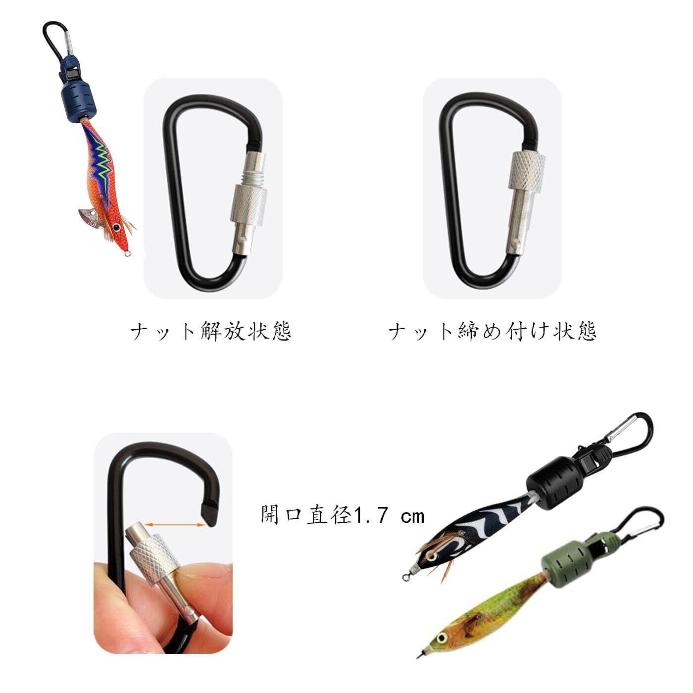 2.多機能セット:フックカバー*6、登山バックル*7、シリコンバックル*1。フックカバーサイズ:約4.5×2 cm。多様な釣りニーズに対応し、釣り愛好家の必須ツールの組み合わせです。