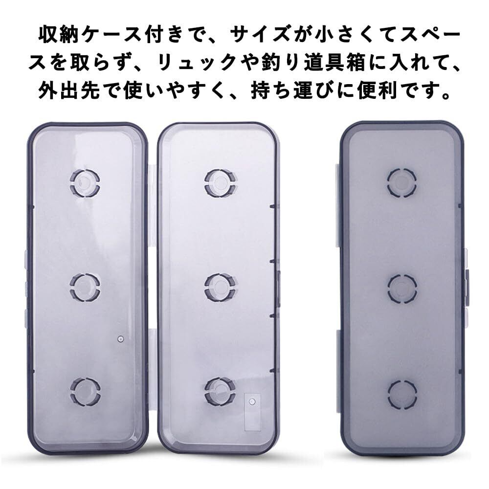 収納ケース付きで、サイズが小さくてスペースを取らず、リュックや釣り道具箱に入れて、外出先で使いやすく、持ち運びに便利です。