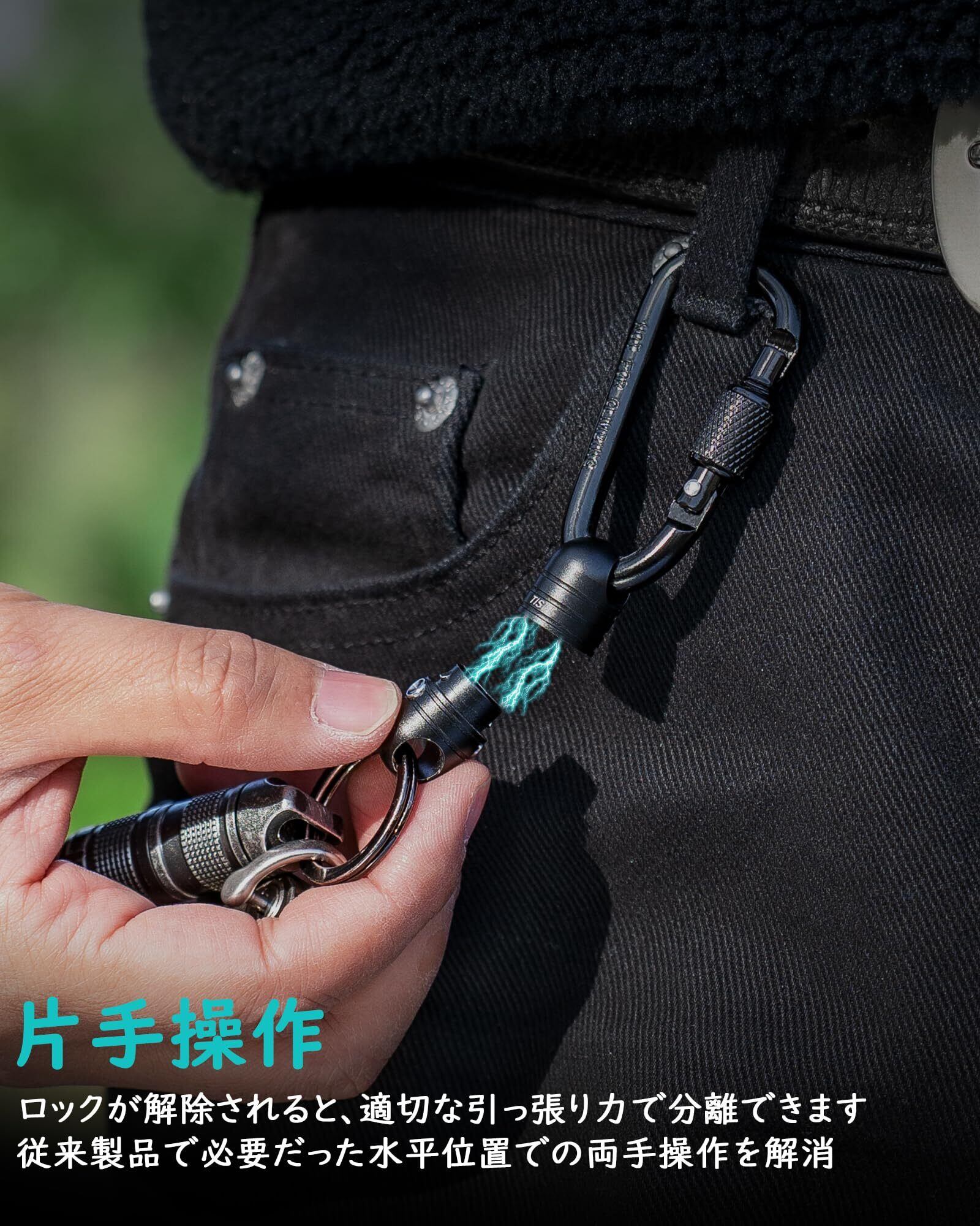 ロック機能付きカラビナ:アルミ合金製カラビナキーホルダーにはロック機能が付いています。スリーブを開口部に対して上向きに回すとロックでき、下向きに回すとロックが解除されます。バックパック、ベルト、タックルバッグ、フィッシングベストに簡単に固定でき、使用の柔軟性が向上します。