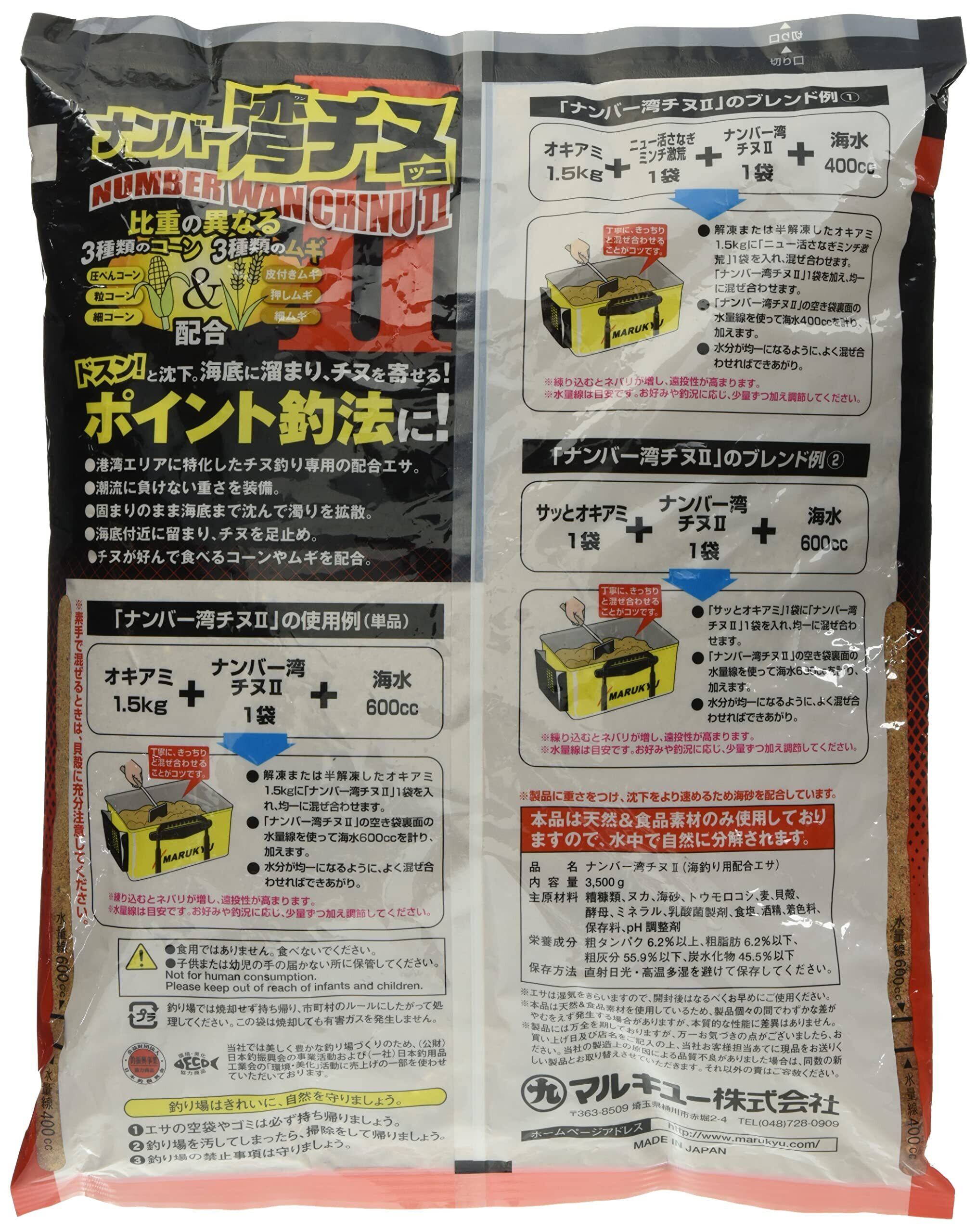 海底へ一気に沈んでポイントを形成港湾の波止・堤防でのチヌフカセ釣りに特化し、なかでも1カ所にチヌを寄せて釣る“ポイント釣法"に最適。ご好評いただいている「ナンバー湾チヌ」をバージョンアップ。粒子がきめ細かくなり、まとまりのよさと使い勝手がさらに向上しました。また重さとネバリが増し、潮流のなかでも海底まで固まりのまま沈下。濁りを拡散してチヌを寄せます。さらに、圧ぺんコーン、粒コーン、細コーン、そして皮付きムギ、押しムギ、細ムギと、大きさや形の違う3種のコーンと3種のムギを配合。それぞれが異なるスピードで沈み、視覚へ強烈にアピール。濁りと相まって、足止めの効果も期待できます。内容量は、たっぷり使える3,500g。使い勝手がよく、海底にしっかりポイントをつくって一点集中でチヌを寄せるアイテムです。