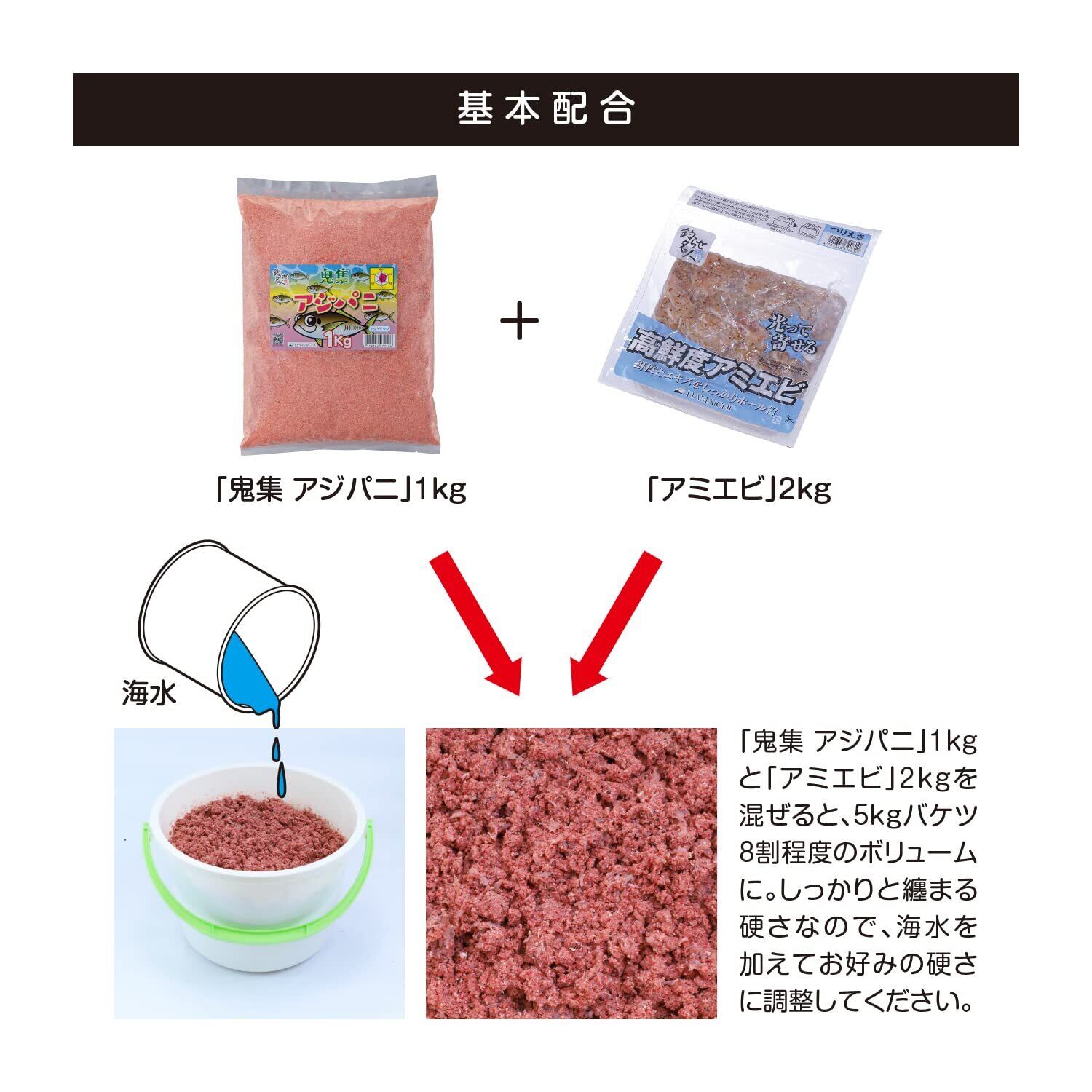 使い方は、アジパニ1袋(1㎏)にアミエビ2㎏(8切)と混ぜて、加水してお好みの硬さに調整してください。
