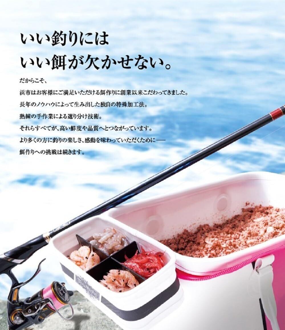 セカンドベイトとは浜市が独自開発した特殊保存液(食品添加物)が可能にした常温タイプの生エサ「セカンドベイト」シリーズ。