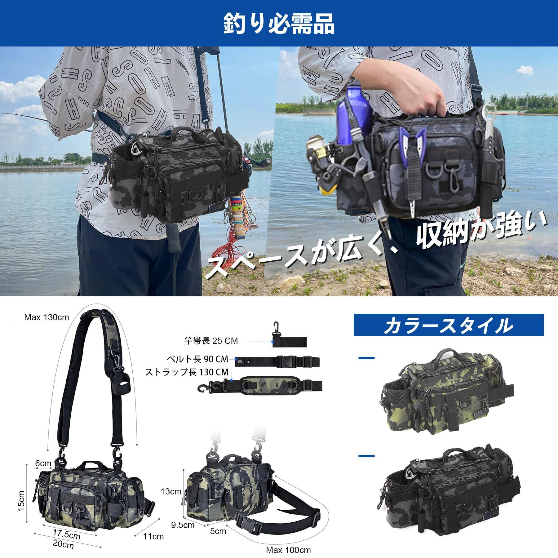 フィッシングバッグ 釣りバック 防水ジッパー ウエストバッグ ワンショルダーバッグ 調節可能なショルダーストラップ 多機能 大容量 アウトドアスポーツ アウトドア釣り