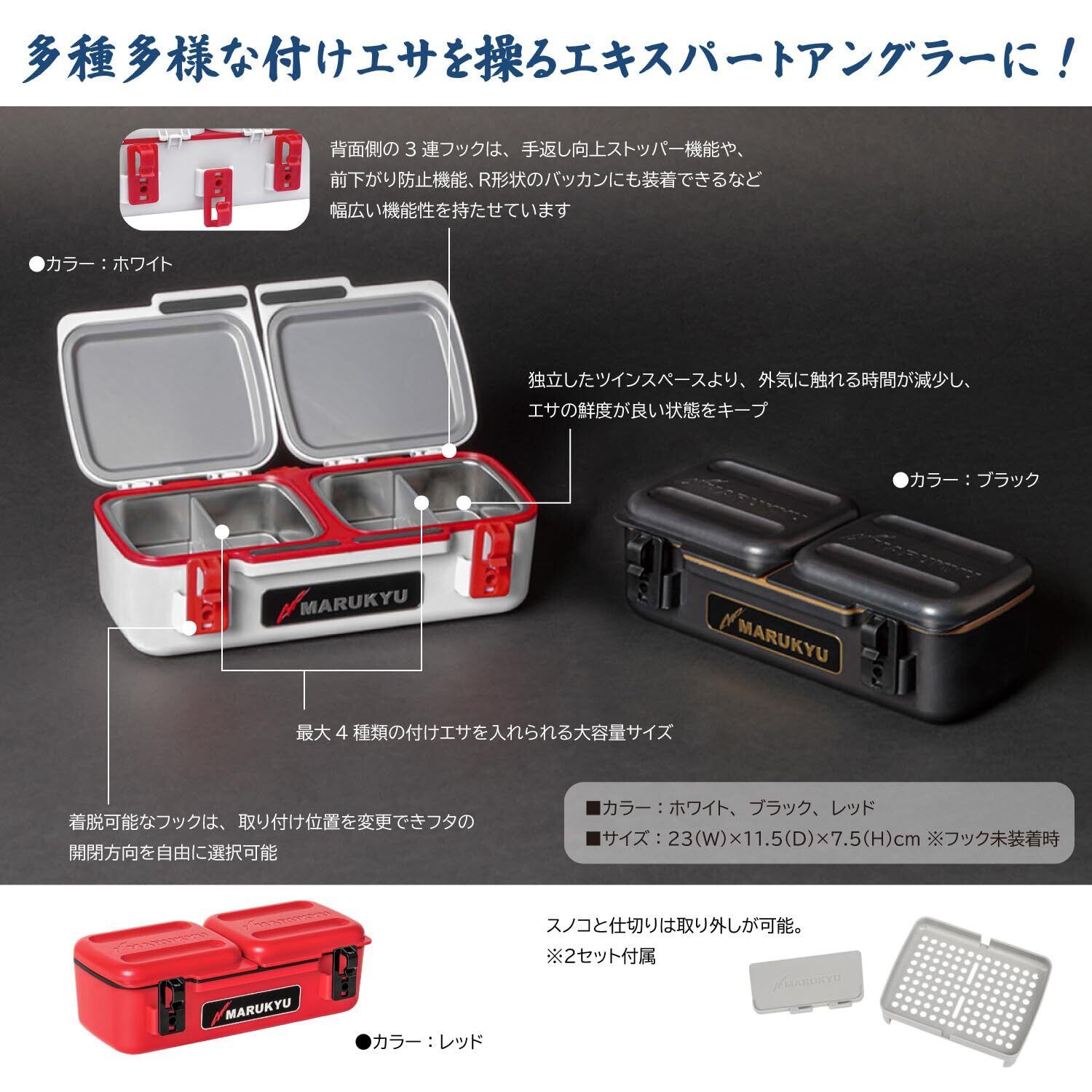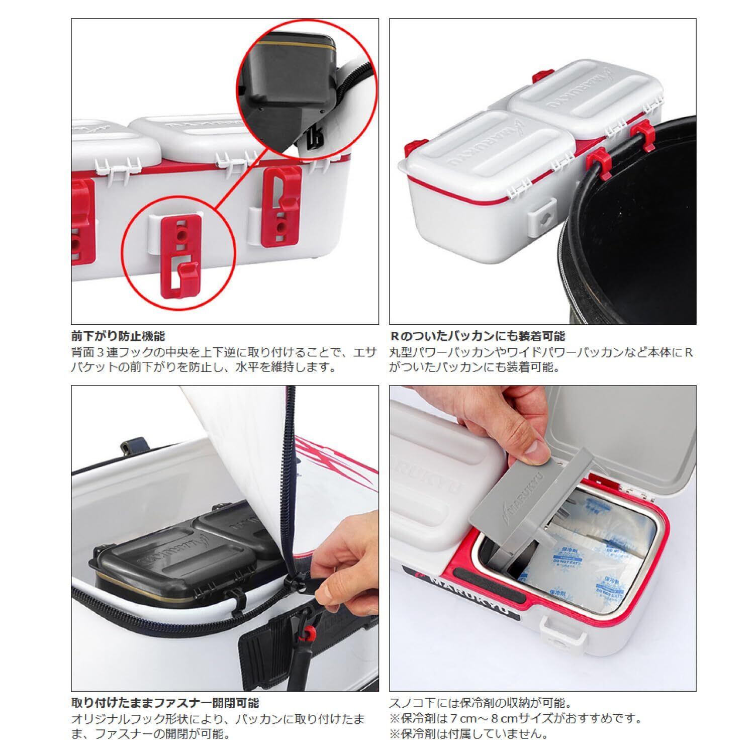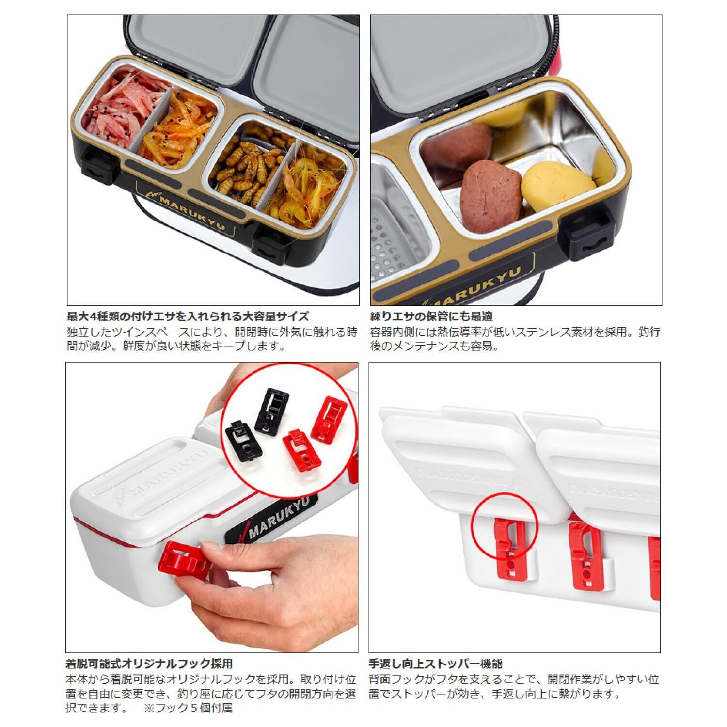 マルキュー(Marukyu)パワーエサバケットSP!!多種多様な付けエサを操るエキスパートアングラーに。密閉性が高く、付けエサの乾燥を防ぐ多機能エサバケットです。仕切りを使えば、最大4種類の付けエサを収納可能。独立したツインスペース構造により、開閉時に外気にさらされる時間を減少し、エサの鮮度をキープします。内側にはステンレス素材を採用しており、練りエサの保管にもおすすめ。釣行後のメンテナンスも簡単です。スノコ下には保冷剤を入れるスペースがあり、温度管理もサポートします。 着脱可能なフックは、利き手や釣り座、風向きに応じて取り付け位置を変更でき、フタの開閉方向を自由に選べます。背面側の3連フックは使い方によって、手返し向上に貢献する天面フタのストッパー機能や、前下がり防止機能、R形状のバッカンにも装着できるなど幅広い機能性を持たせています。また、オリジナルフック形状により、バッカンの内側にセットしたままでもファスナーの開閉が可能※です。正面には金属製のロゴプレートをあしらい、フィールドで存在感を放ちます。※他メーカーのバッカン使用の場合、ファスナーが閉まらない場合があります。