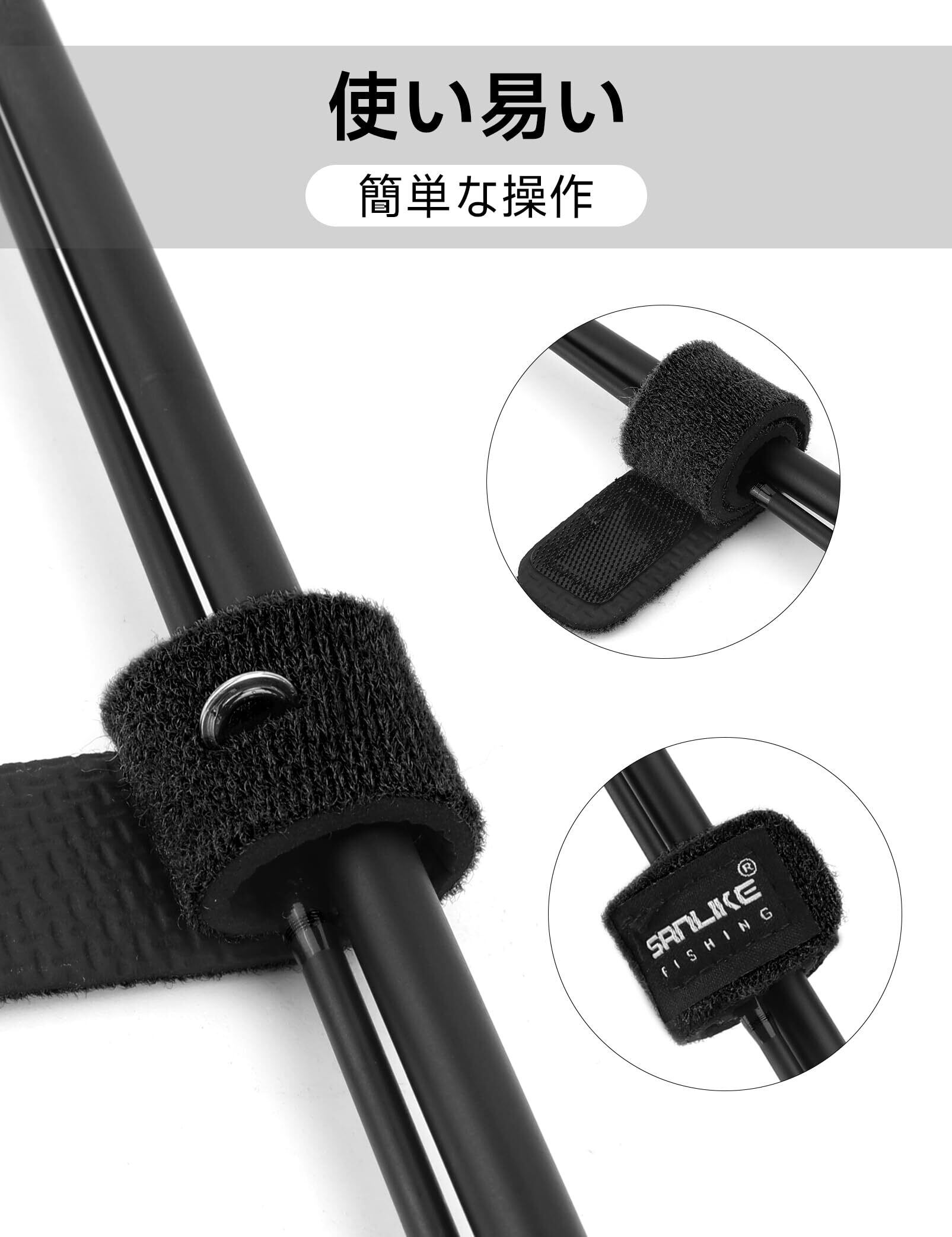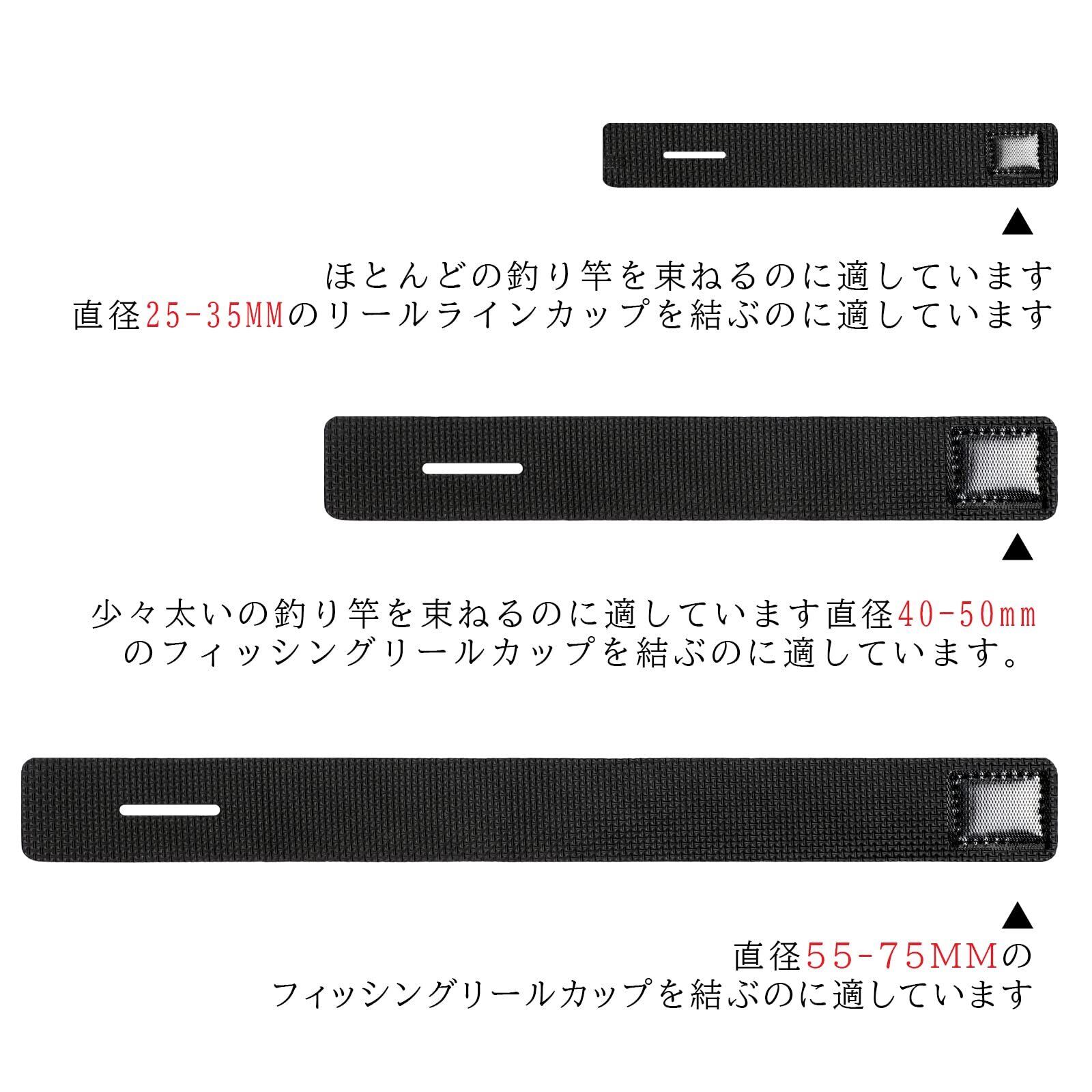 【2サイズ選べる】 15cm(細竿用)・24cm(グリップ部)。バス釣りから沖釣りまで、ロッドバンド1セットで竿をスリムにまとめ、移動時の絡み付き問題を解消します。