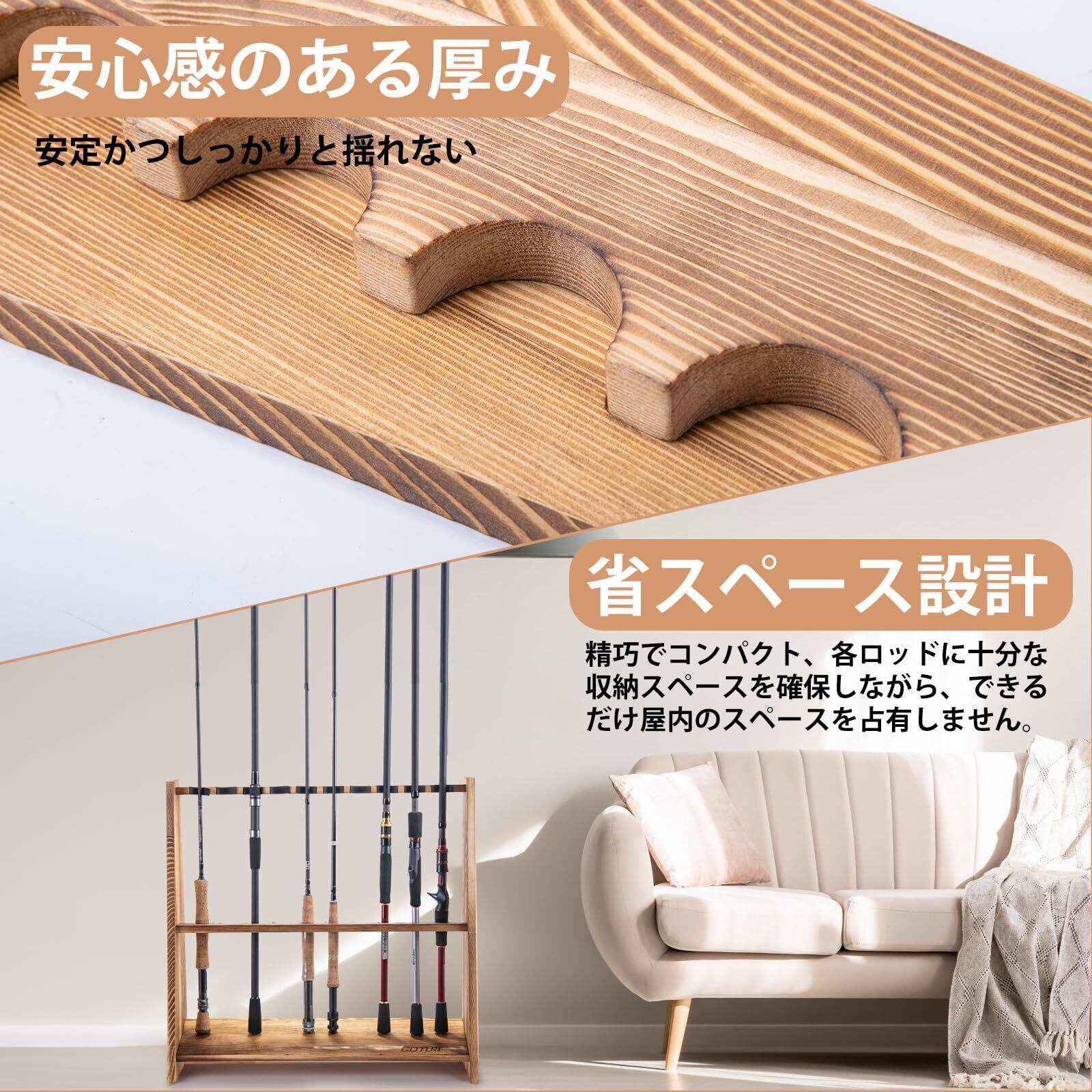 【優れた耐久性&高品質な素材】天然無垢の松材を使用し、表面は丁寧に磨かれ、炭化処理が施されています。湿気防止、カビ防止、傷防止の効果があります。木の色は純正で、無臭なので、家庭内でロッド収納スタンドやロッド展示スタンドとして使用するのに適しています。家に特別な高級感を加える。