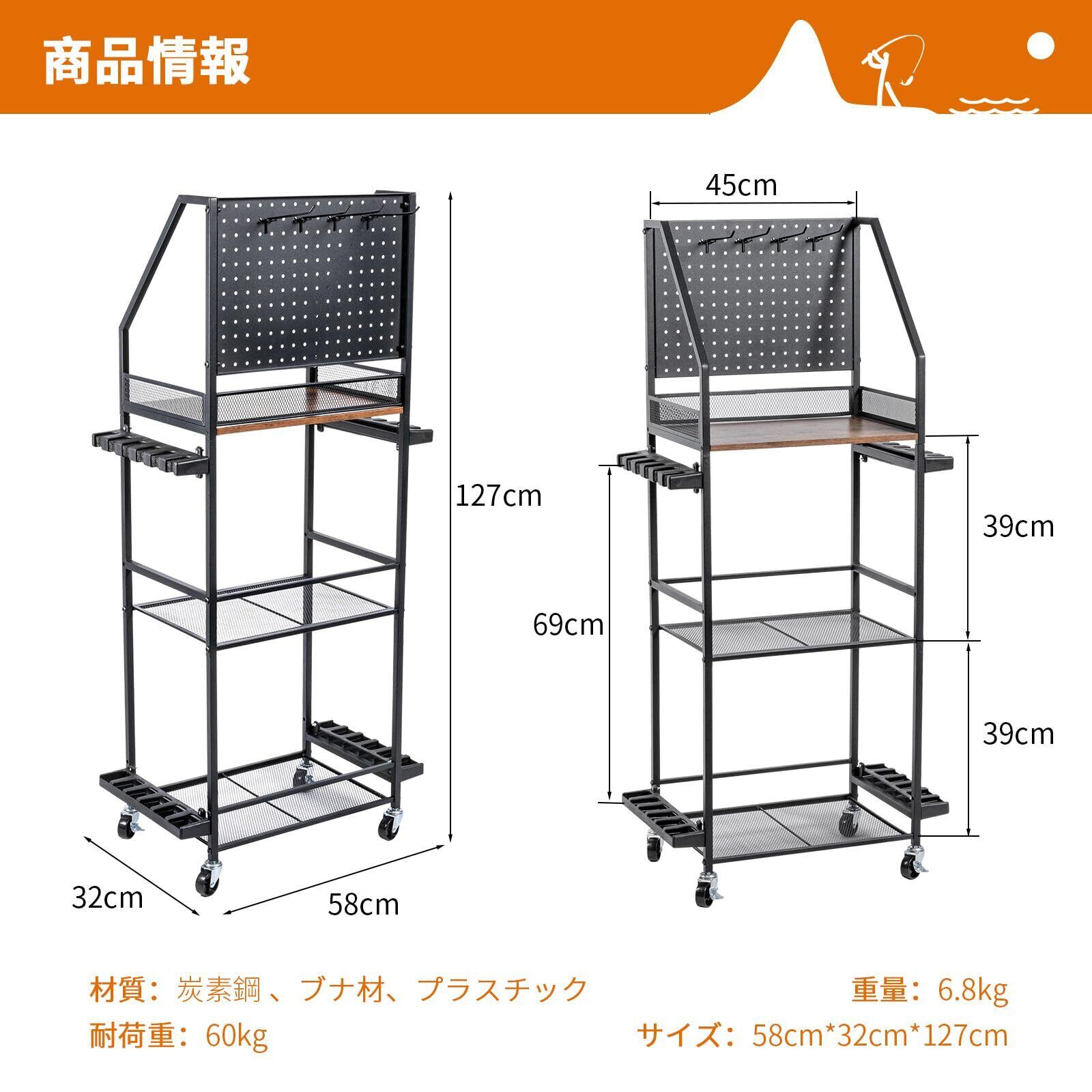 【三段式大容量ロッドスタンド設計】釣り竿やルアーーボックスなど多様な大型釣具をまとめて収納可能な三段構造。専用ロッドホルダーを備えた頑丈なフレームが、竿やタックルボックスの重みに耐え、スペース効率最大化で釣り場の整理整頓を徹底サポートします。
